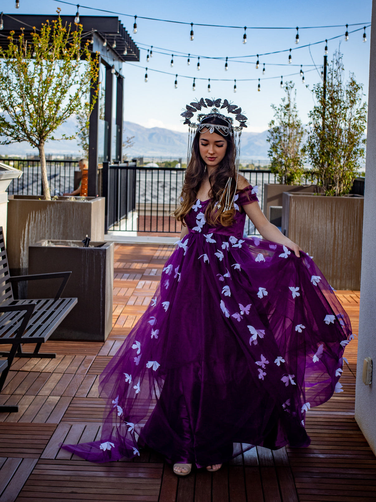 The ultimate OOAK fairy dress! This dark purple tulle gown with butterflies is a one-of-a-kind gown has off-the-shoulder style, full length with train. Fits sizes 2-12 and has corset back to adjust up or down for the perfect fit. Top layer is Butterly 3-D fabric, the lower layers are dark plum tulle. This gown is a sample gown and is the exact gown shown in photos. Headpiece NOT included. Free shipping within the US.