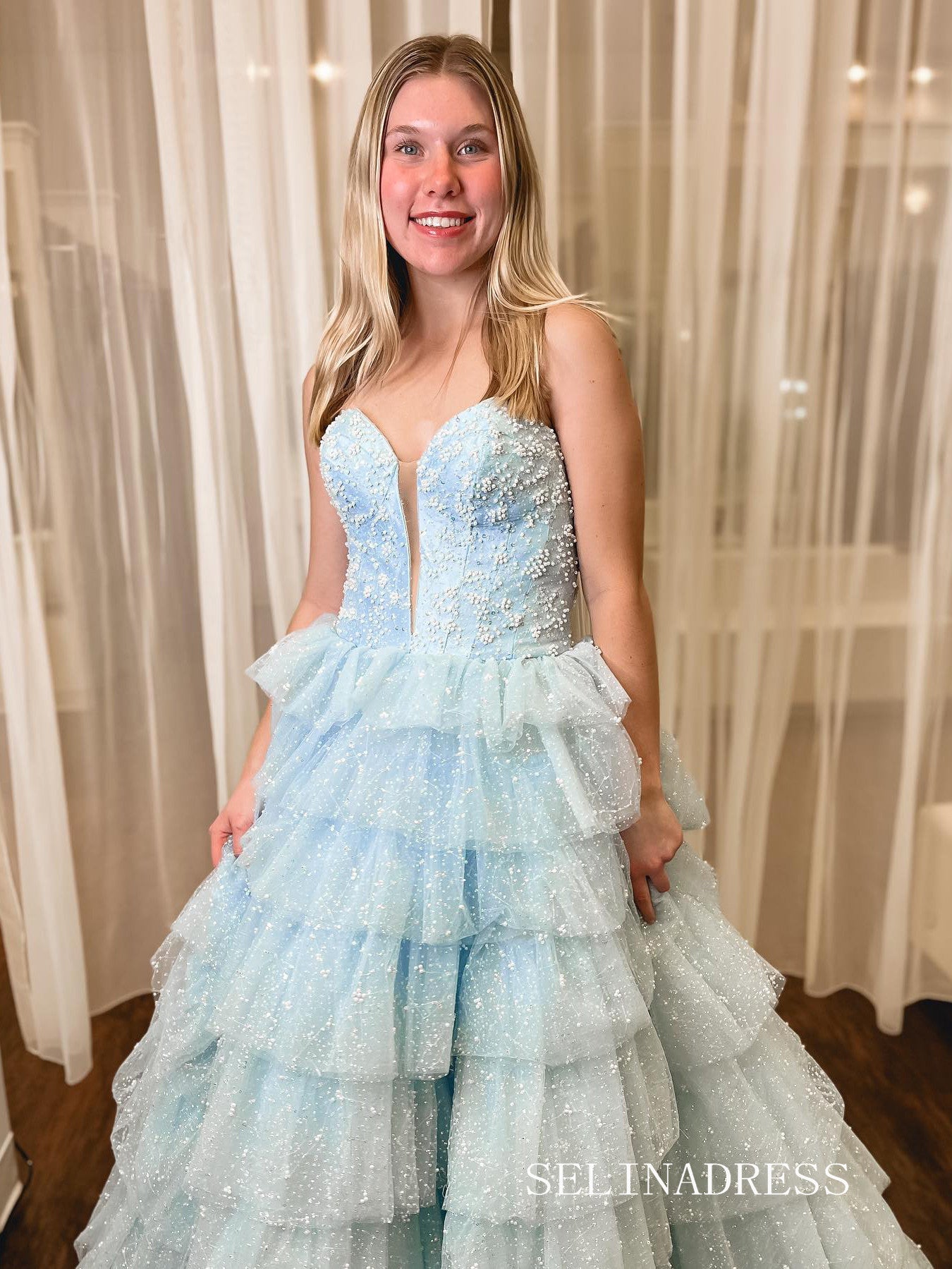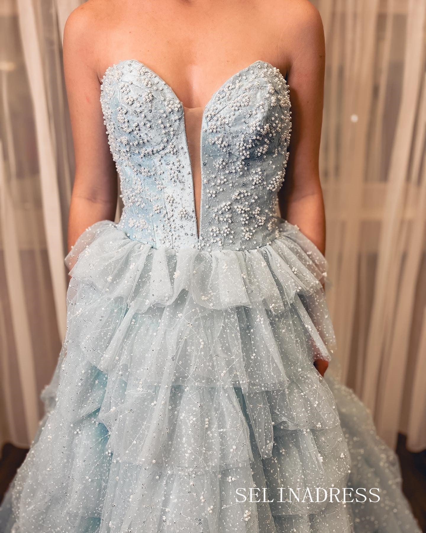 The long dress radiates in a delicate shade of sky blue, captivating with its strapless design and sparkling mesh fabric. The upper bodice sparkles with intricate beadwork, while the lower skirt billows in layers of ethereal mesh ruffles. This ensemble embodies elegance and modernity, creating a breathtaking silhouette.