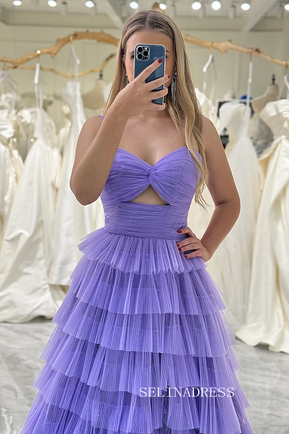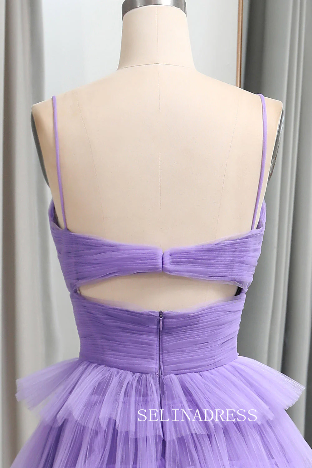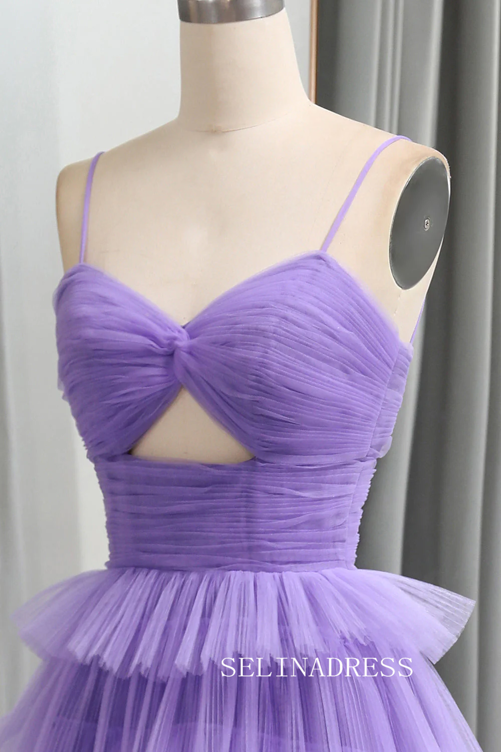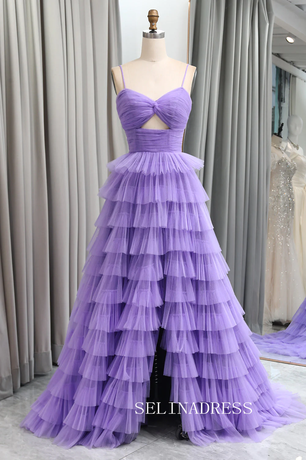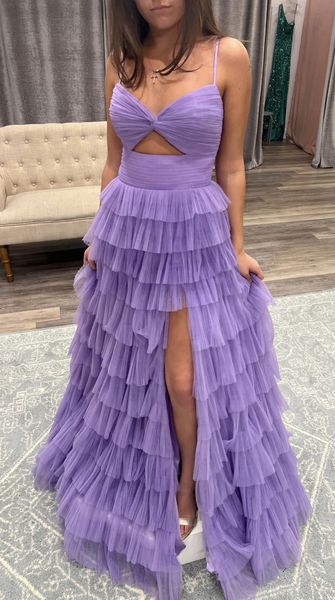 The lilac long prom dress features spaghetti straps and a tiered skirt design, embodying elegance and femininity. The thigh-high slit adds a seductive touch, while the purple hue enhances the overall glamour. This dress is a perfect blend of sophistication and sexiness.