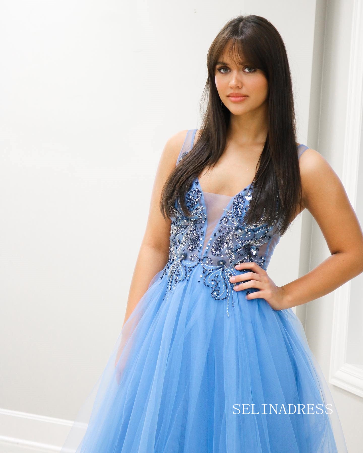 The captivating blue prom dress is a masterpiece of design. The bodice, adorned with dazzling beading, sparkles and shimmers in the light, adding a touch of allure and drama. The skirt, made of a mesh fabric, flows gracefully and creates a flattering silhouette. This dress is perfect for the woman who wants to exude confidence and allure, leaving a lasting impression on those around her.