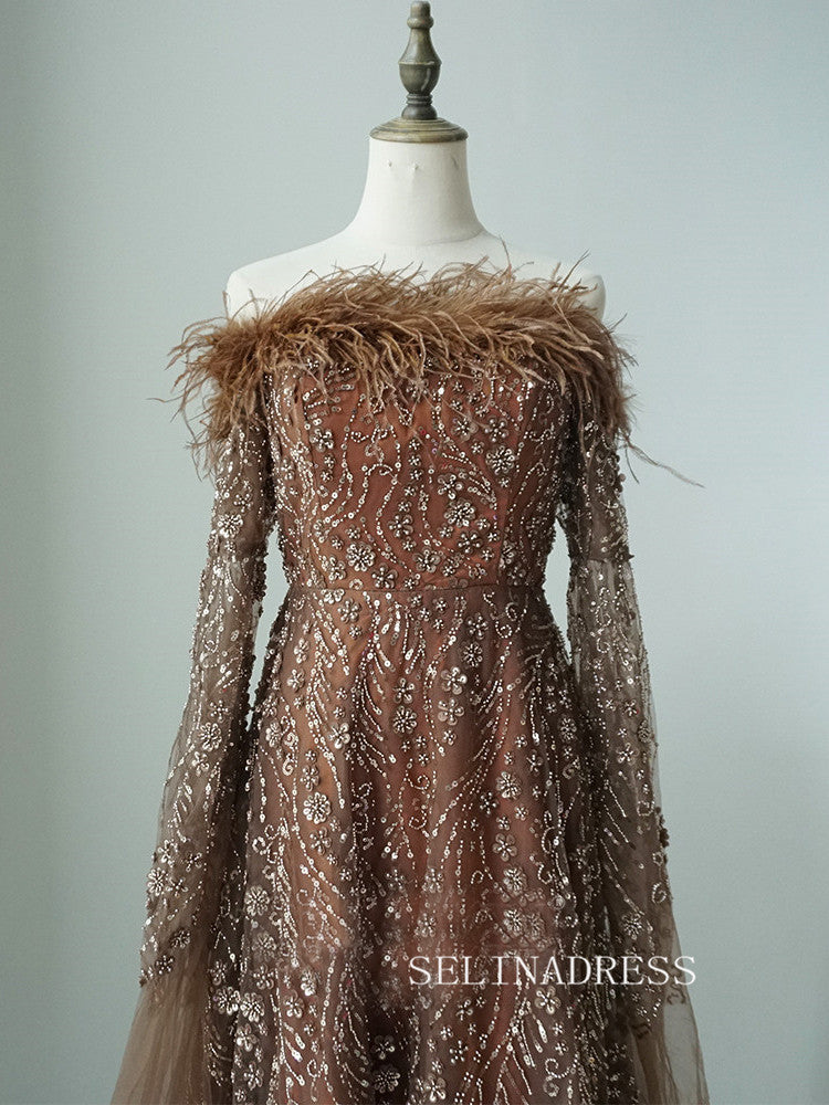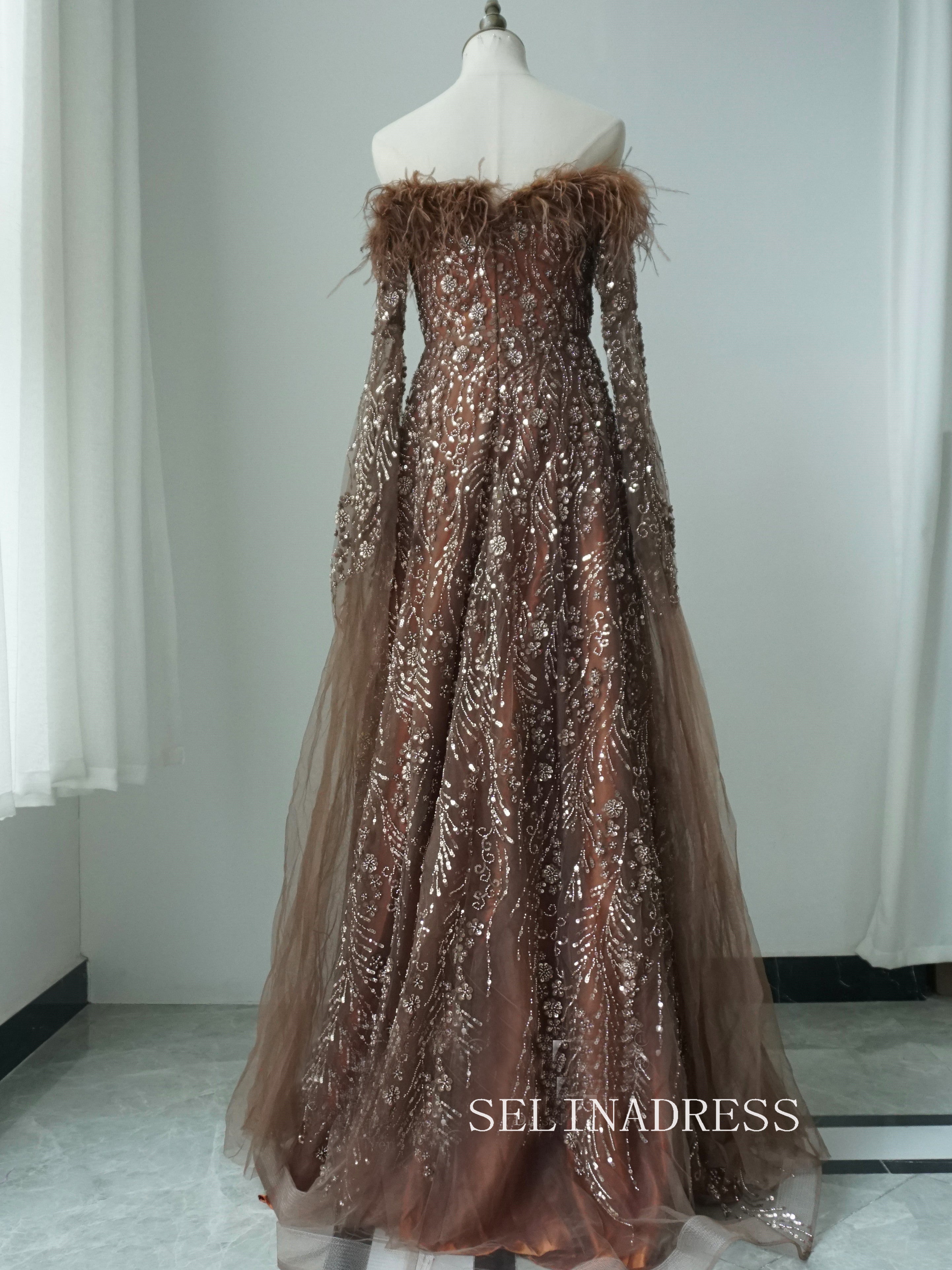 This SELINADRESS Brown Feathered Beaded Evening Dress is a magnificent choice for your elegant evening. The brown hue adds a touch of sophistication, while the golden beading and feather sleeves create a luxurious feel. The voluminous skirt adds movement, making you stand out in any formal setting.