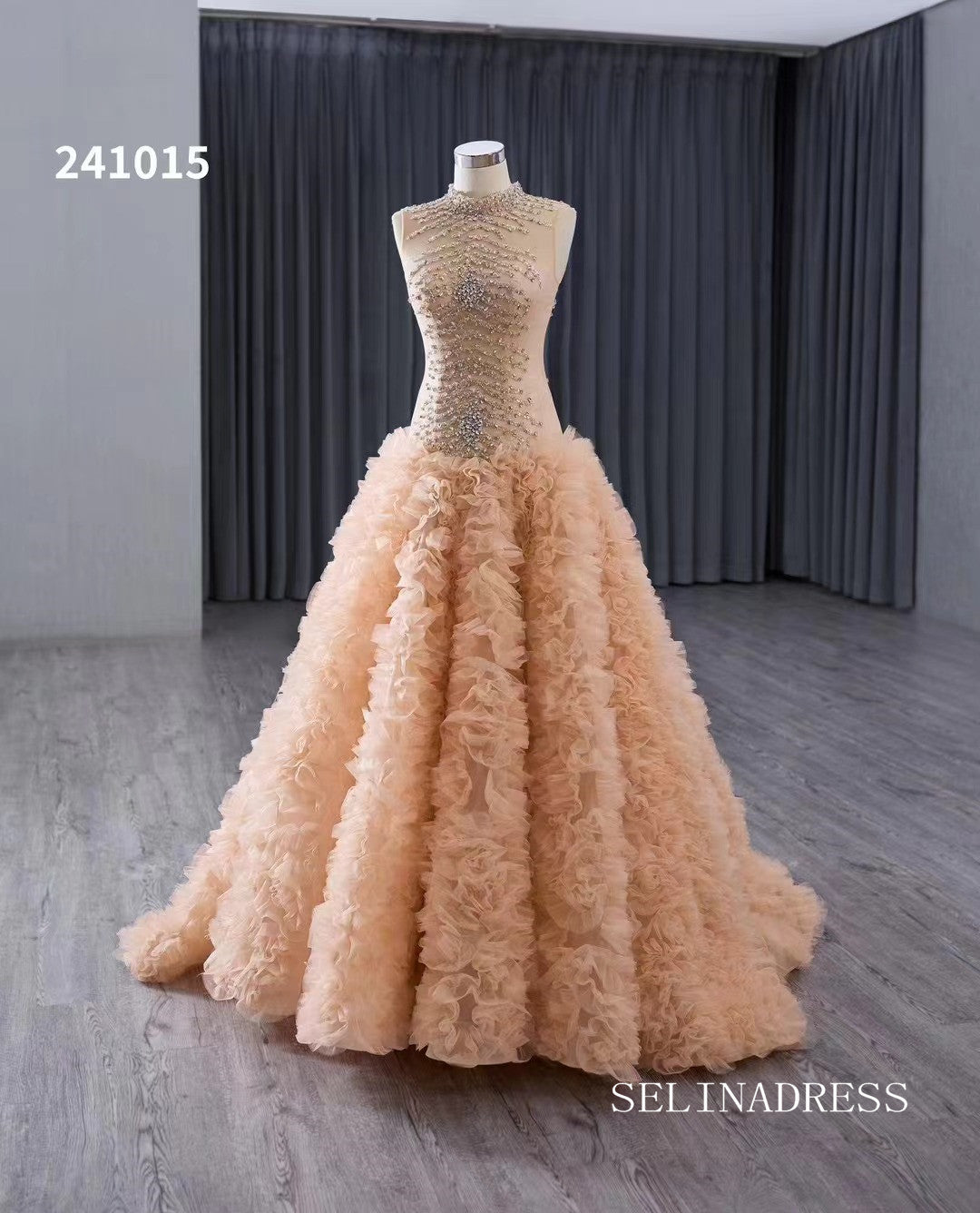 The champagne wedding dress radiates elegance with its sparkling beaded bodice and feathery, layered skirt. Its intricate ruffles and feathery accents create a captivating effect, making it a standout choice for any special occasion. SELINADRESS's masterpiece showcases exquisite craftsmanship.