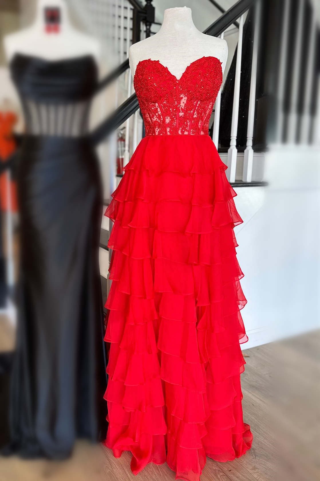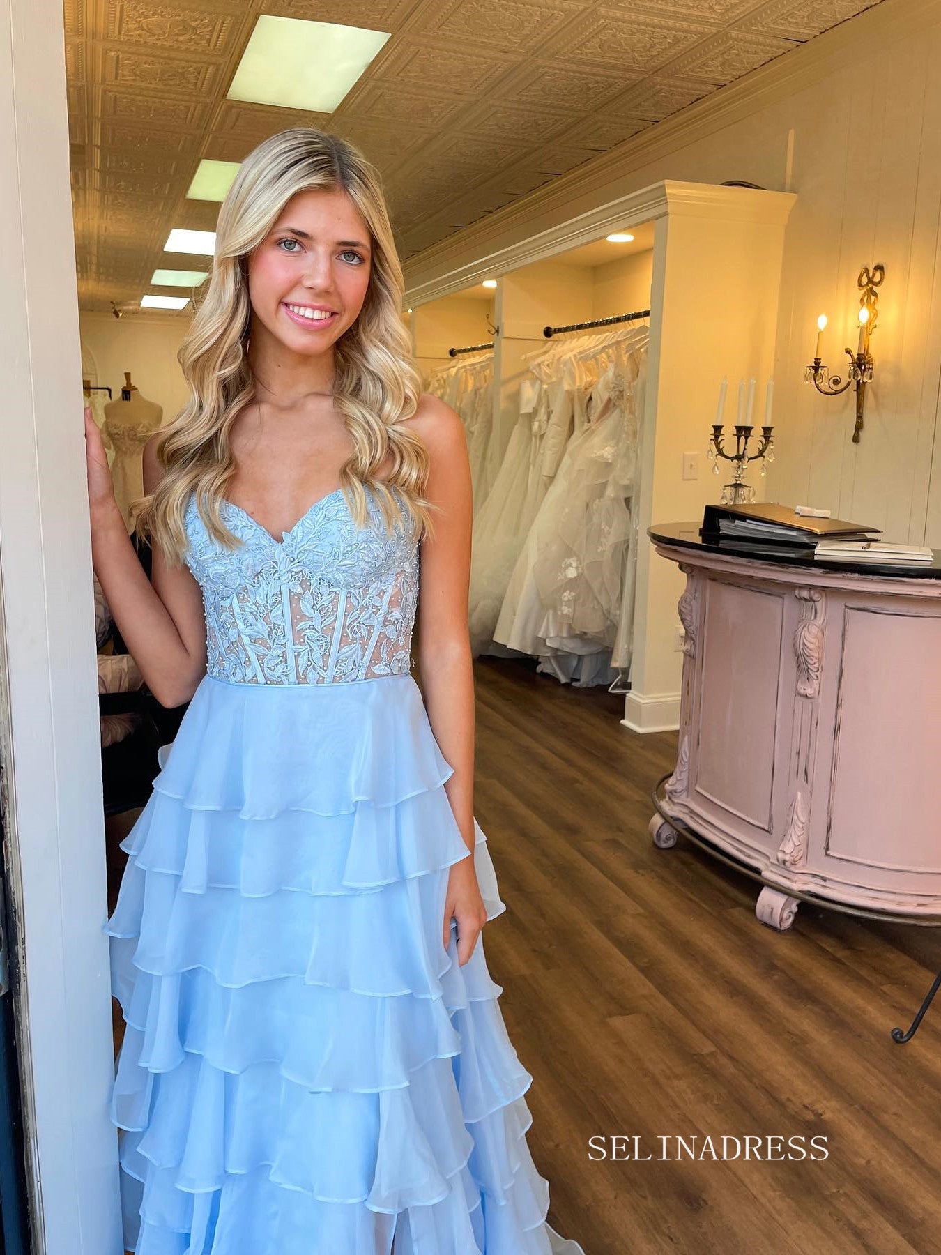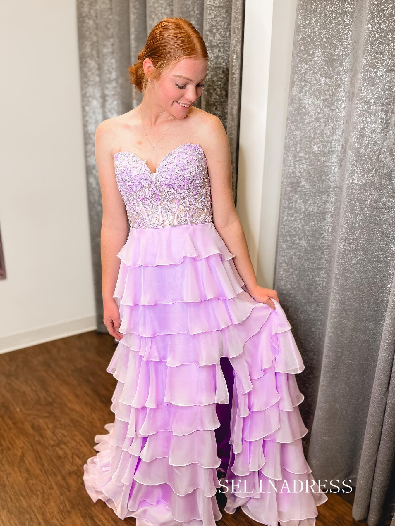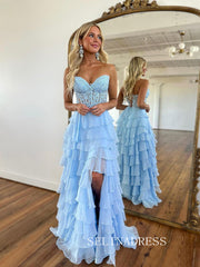 This long prom dress is exquisitely designed, with sweetheart neckline showing off an elegant temperament. The lace on the upper body is light and elegant, and the multi-layered ruffles on the lower skirt add a charming charm, showing off romantic charm.