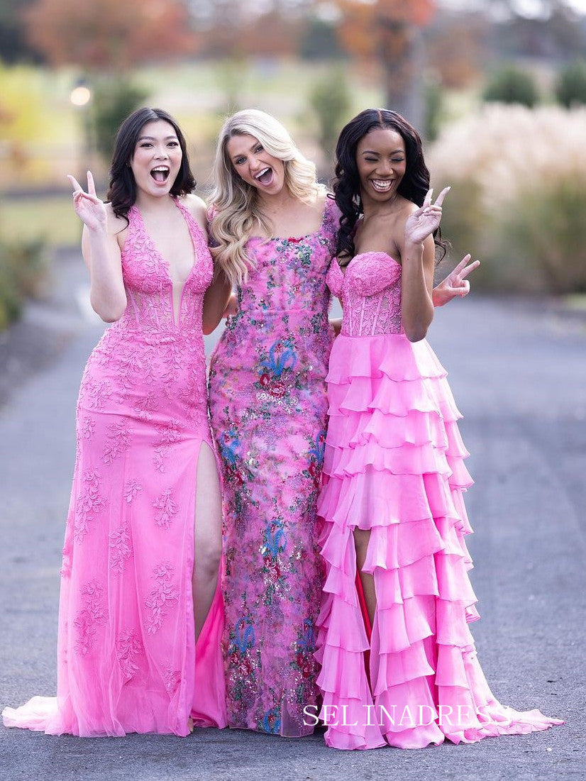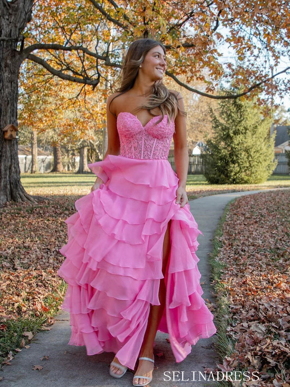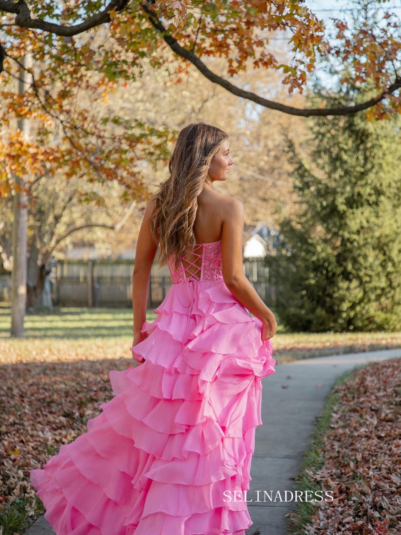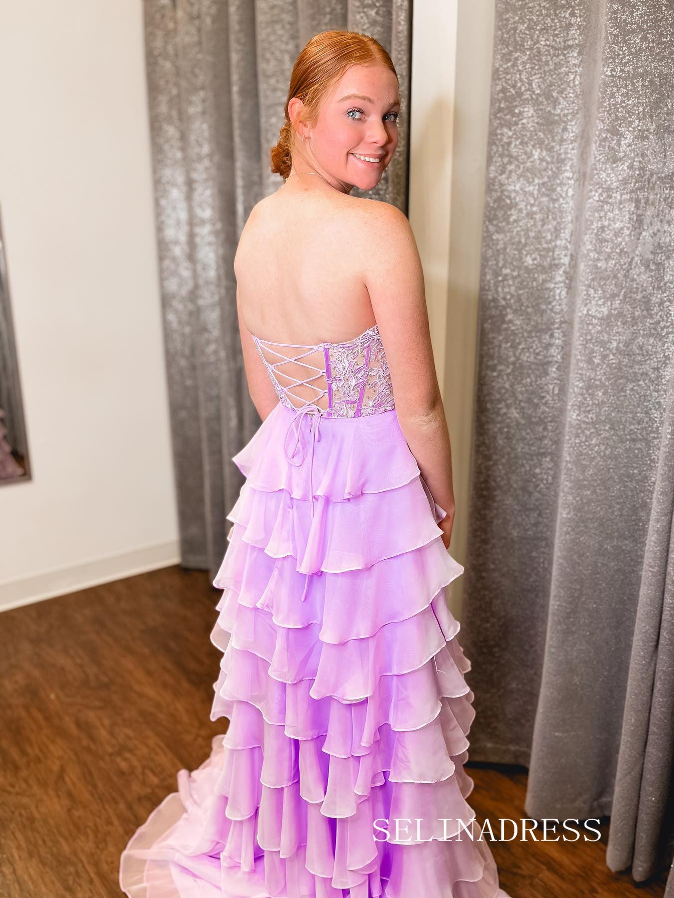 This long prom dress is exquisitely designed, with sweetheart neckline showing off an elegant temperament. The lace on the upper body is light and elegant, and the multi-layered ruffles on the lower skirt add a charming charm, showing off romantic charm.