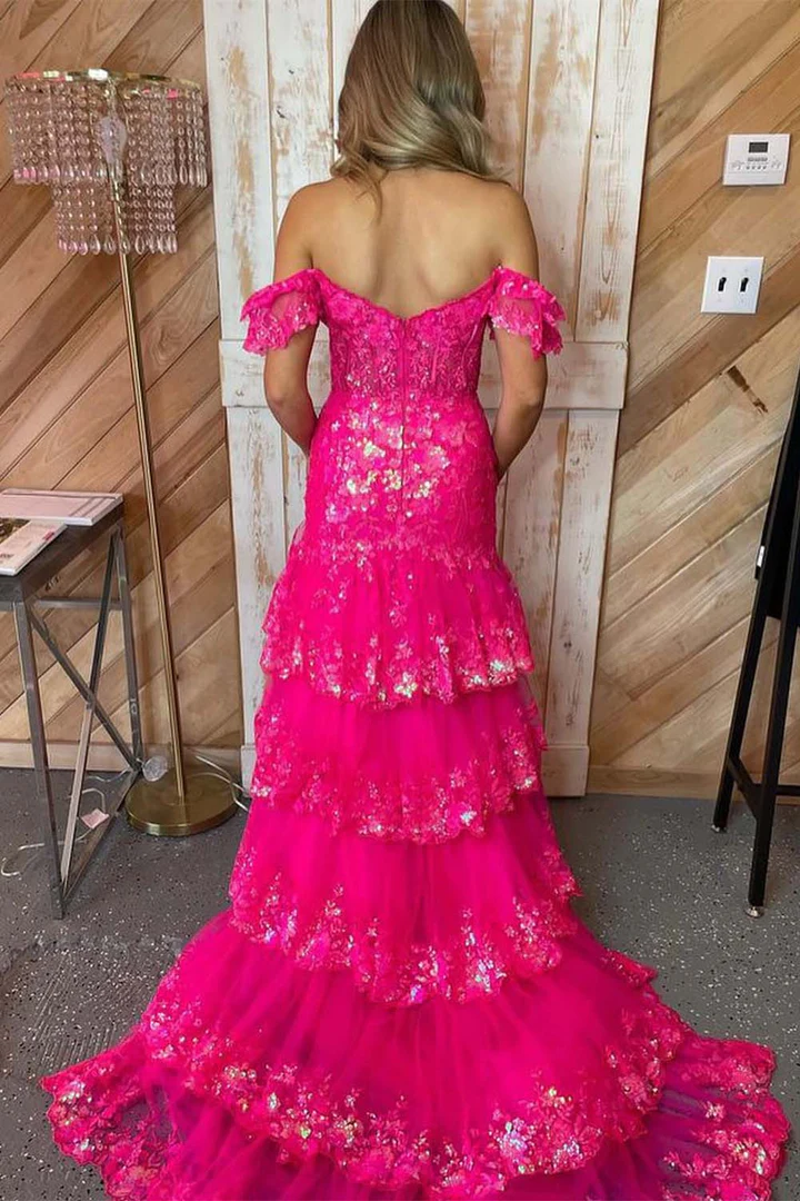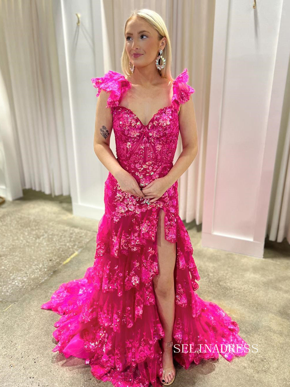 This fuchsia mermaid sequined lace long prom dress shows off the femininity and elegance of women. Delicate lace and sparkling sequins complement each other, the slim-fitting design highlights the body curves, and the fishtail skirt is romantic and elegant.