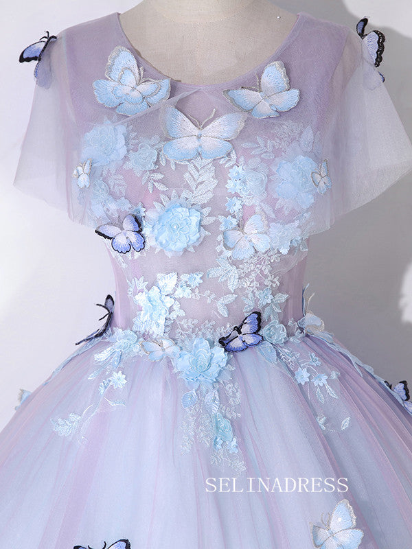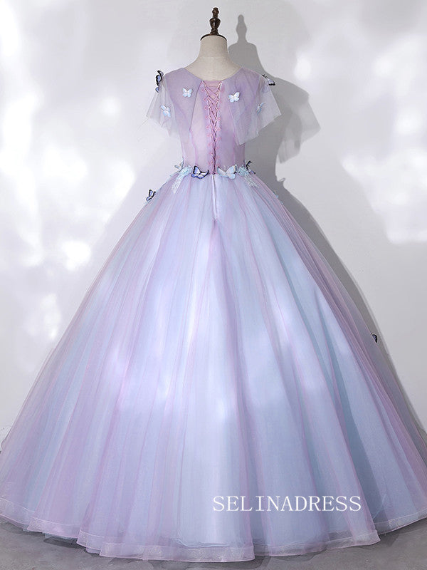 This SELINADRESS gown captivates with its ethereal blend of pastel purple and pink hues. Adorned with intricate lace flowers and shimmering sequins, it boasts a graceful scoop neckline and a voluminous skirt adorned with blue bows. The multi-layered tulle creates a dreamy silhouette, embodying elegance and sophistication for any special occasion.