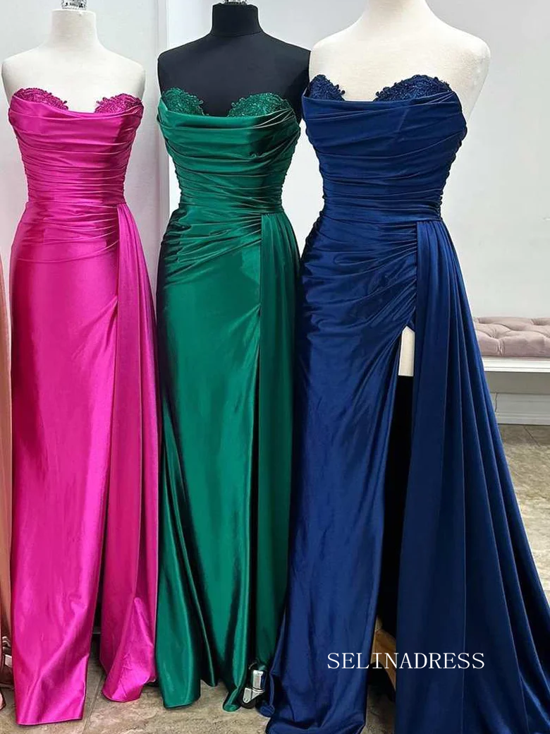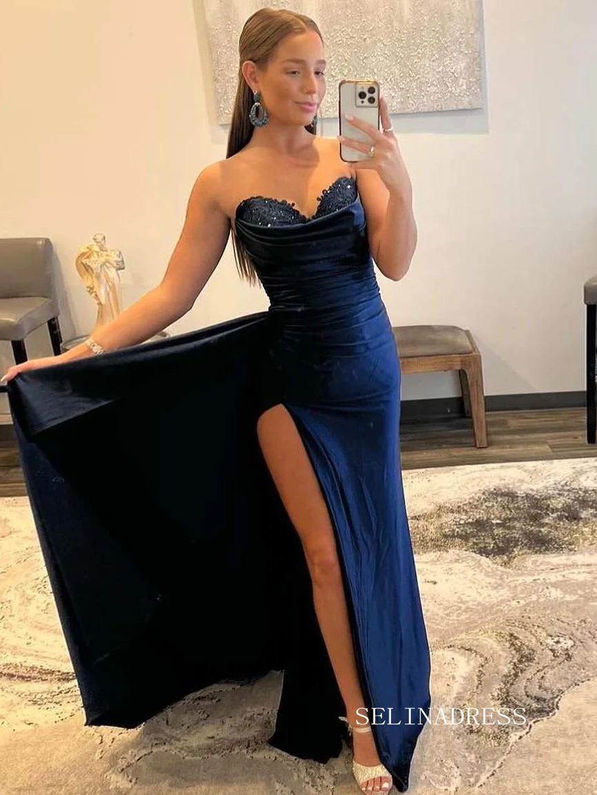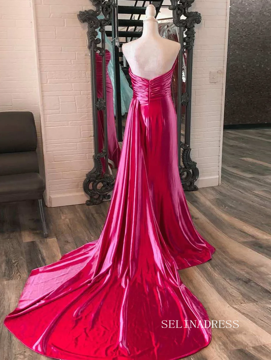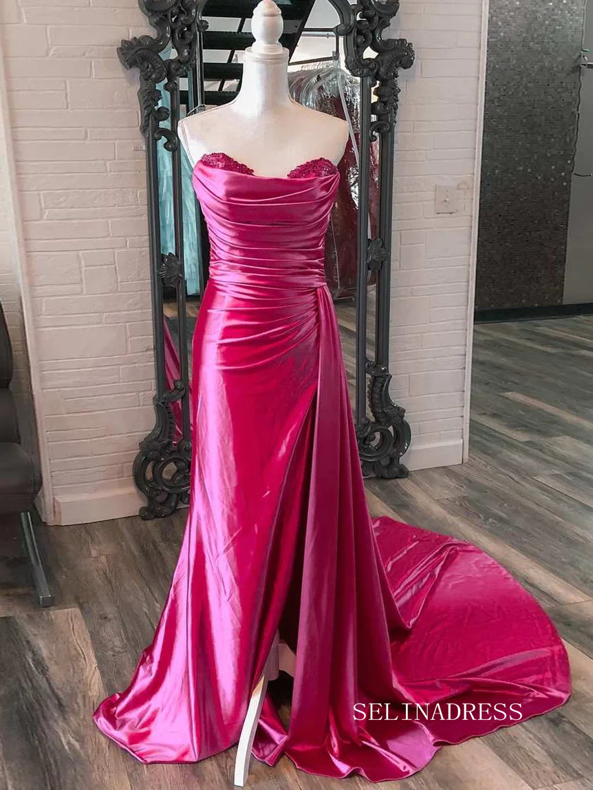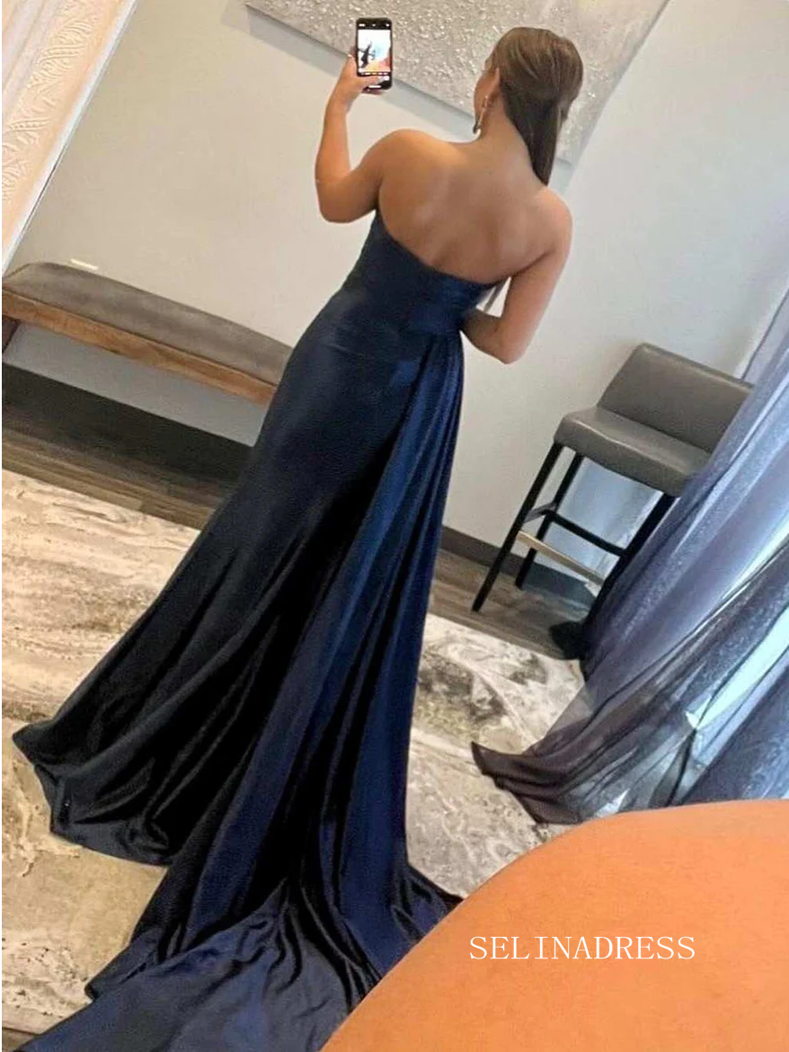 This mermaid silhouette dress features a strapless with sweatheart neckline, a pleated corset bodice, a pair of long gloves, and pleated waist seam create a thigh-high leg slit. The floor length dress with a sweep train add a simple touch of elegant to the look.