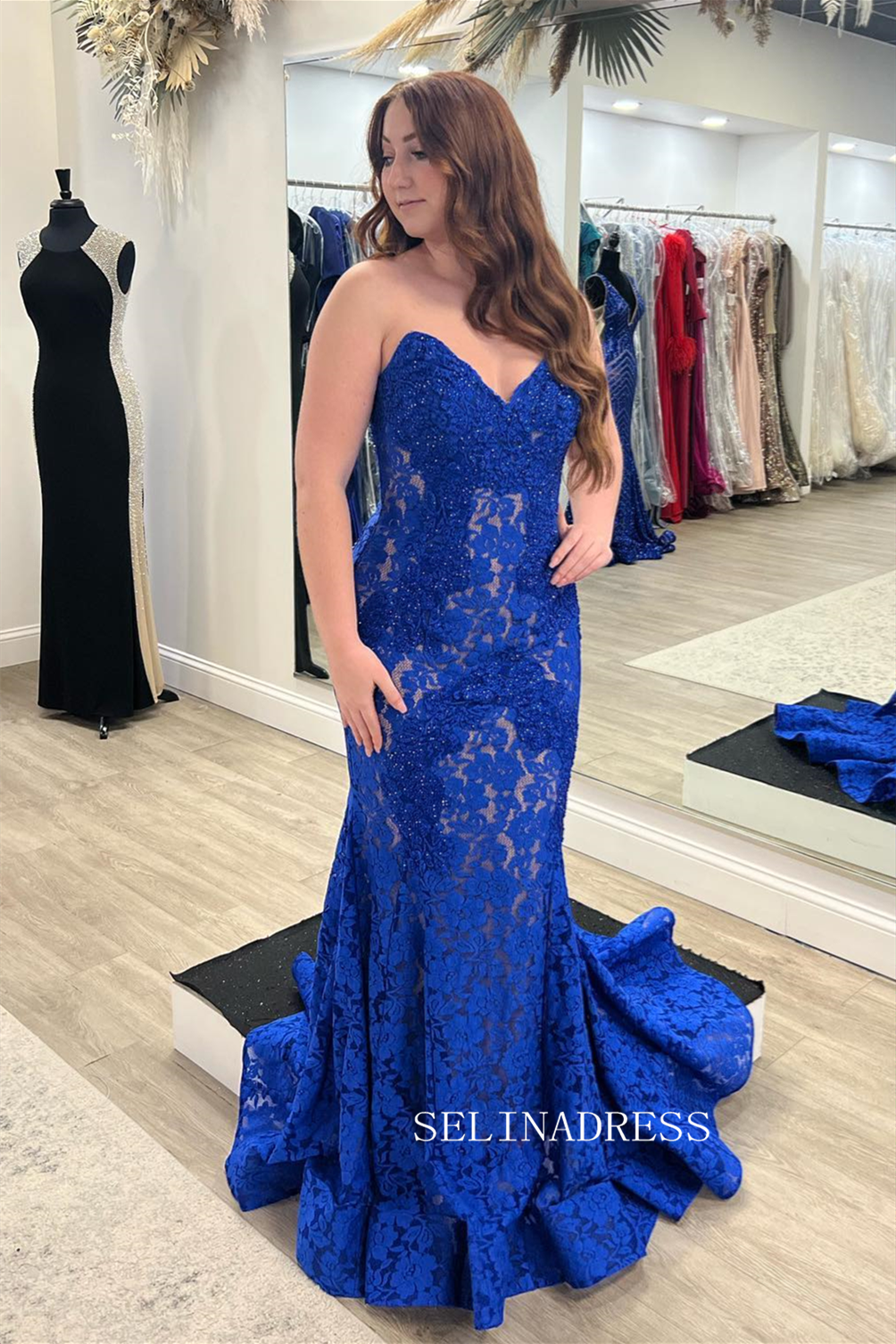 This mermaid silhouette dress features a strapless neckline with a sweetheart, a tight bodice with beaded detail, and a floor-length skirt with the flare at the hemline. The full lace fabric adds the luxurious vibe to the look.