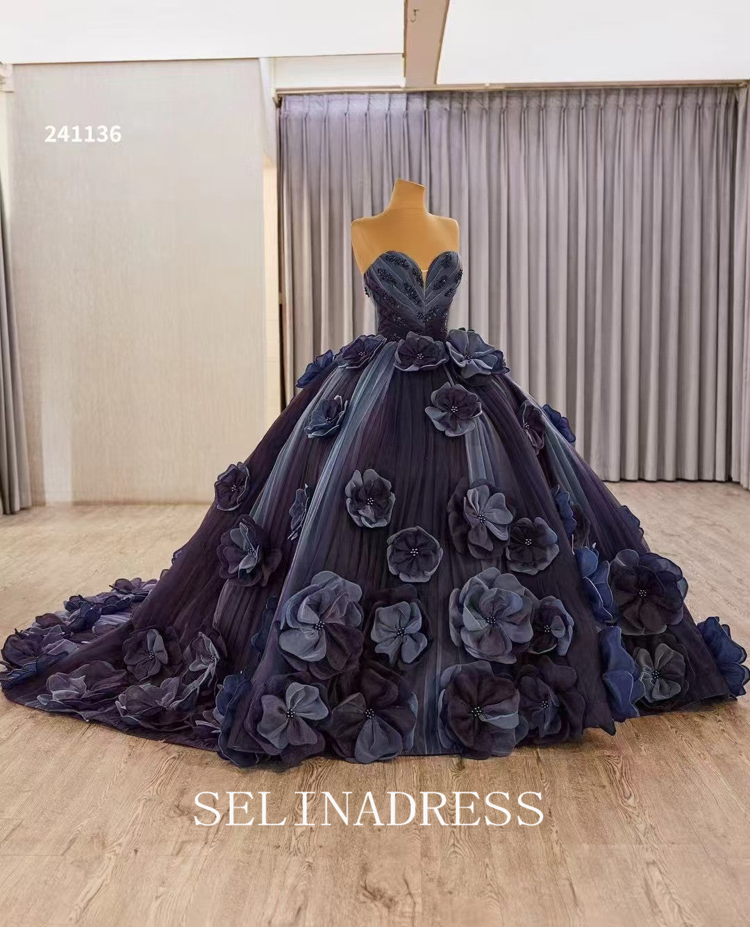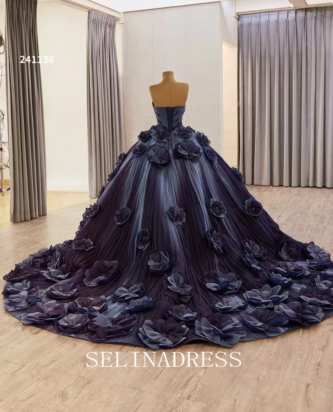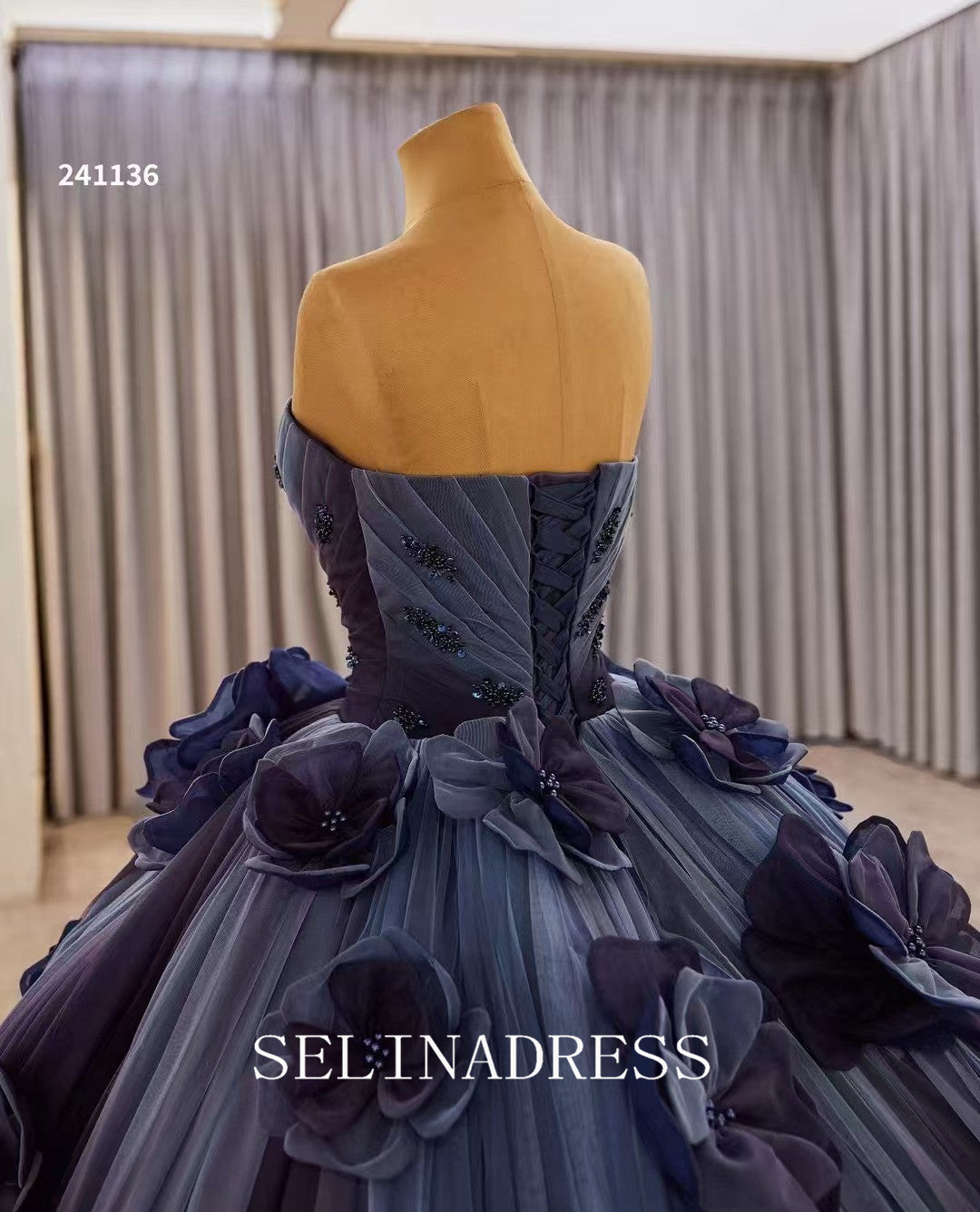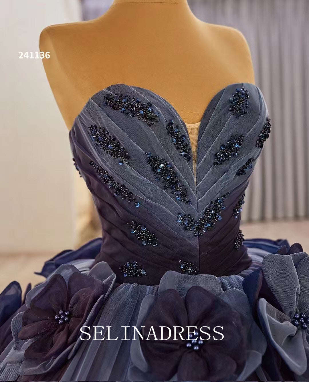 This dark navy luxury prom dress, 241136 by SELINADRESS, is a breathtaking choice. The multi-layered tulle and lace, adorned with deep blue flowers, create an elegant and unique look. The fitted waist and ruffles front add a touch of glamour, while the sleeveless back offers a sleek and sophisticated finish.