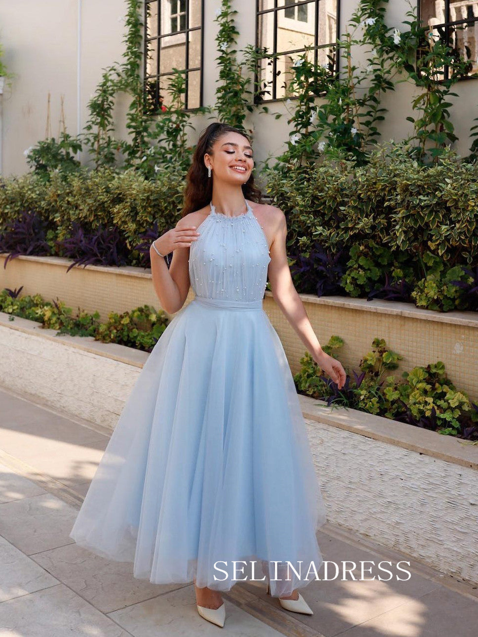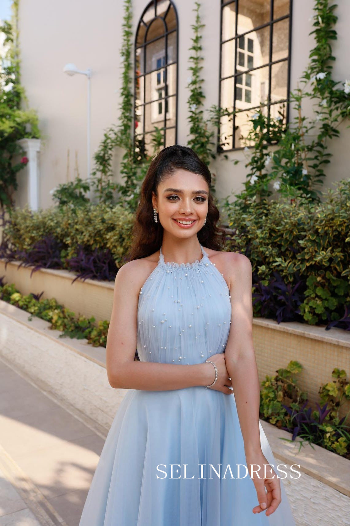 This gown is a chic blend of elegance and modernity. Crafted with a fitted bodice and a voluminous tulle skirt, it flatters the figure beautifully. The light sky blue hue adds a touch of whimsy, making it a perfect choice for any special occasion.