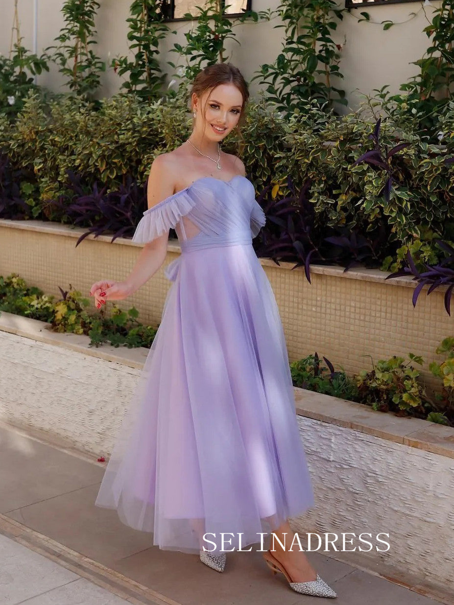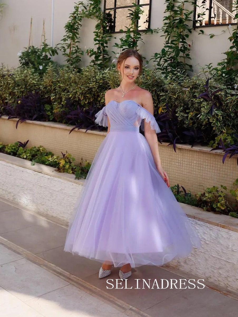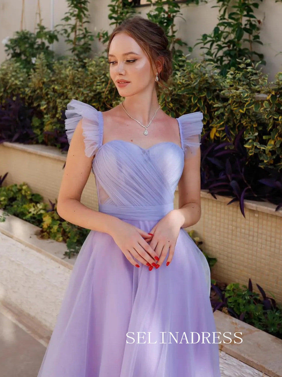This gown is a chic blend of elegance and sophistication. Crafted with a ruched bodice and delicate spaghetti straps, it flatters the figure beautifully. The lilac hue adds a touch of whimsy, making it a perfect choice for any formal occasion.