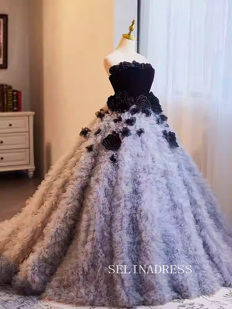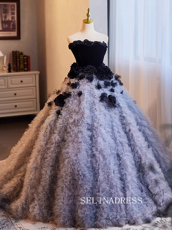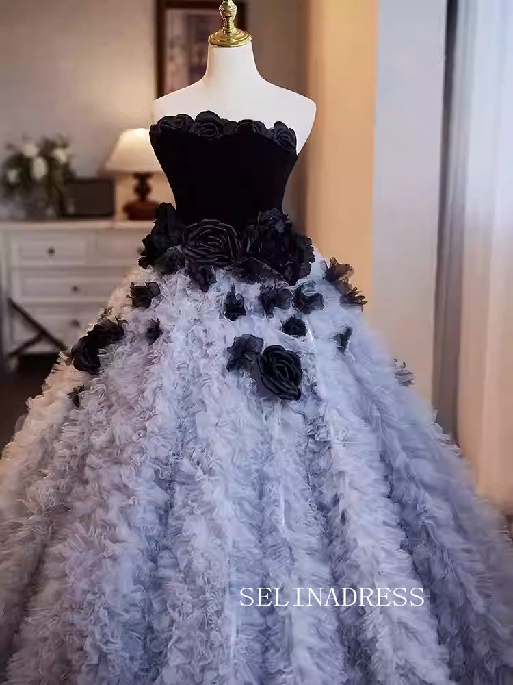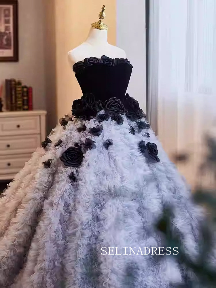 This SELINADRESS Black and Grey Feather Ball Gown is an elegant choice for any formal occasion. The unique design combines black bodice with grey feathered skirt, creating a luxurious and sophisticated look. The large flower decorations add a touch of glamour, making you stand out in any event.