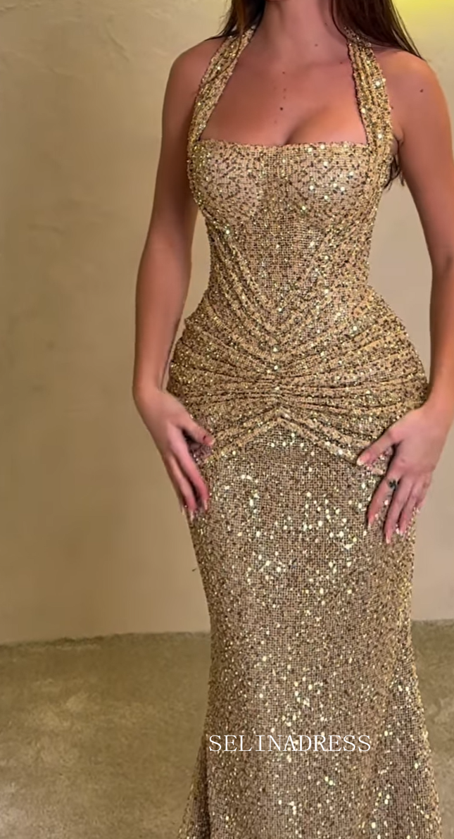 This dazzling gold sequin gown features a chic halter neckline and a form-fitting mermaid silhouette that elegantly hugs every curve. The bodice is intricately ruched, adding texture and dimension, while the entire dress sparkles with shimmering sequins, creating a glamorous and eye-catching effect. Perfect for gala events or upscale soirees, this dress exudes luxury and sophistication, ensuring a show-stopping entrance with its sleek lines and radiant design.