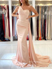 The pink evening dress exudes elegance and femininity. The one-shoulder design highlights the wearer's graceful shoulder line, while the tight bodice contours her silhouette. The wide skirt flares gracefully from the waist, ending in a sweeping train. The simple yet striking silhouette is complemented by the wearer's sleek golden hair and graceful pose. SELINADRESS truly showcases a masterful blend of beauty and design.