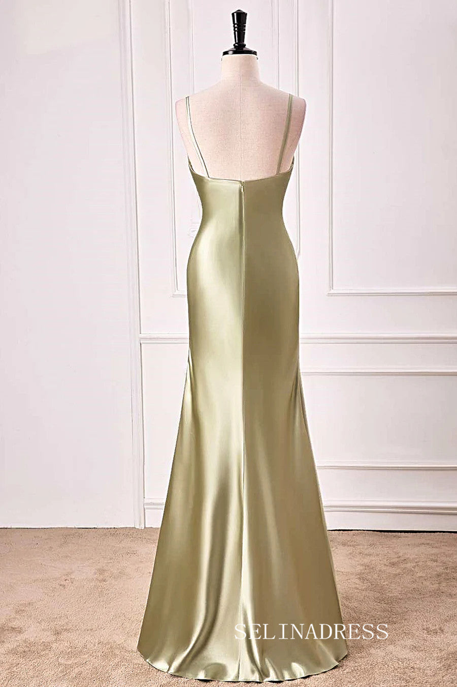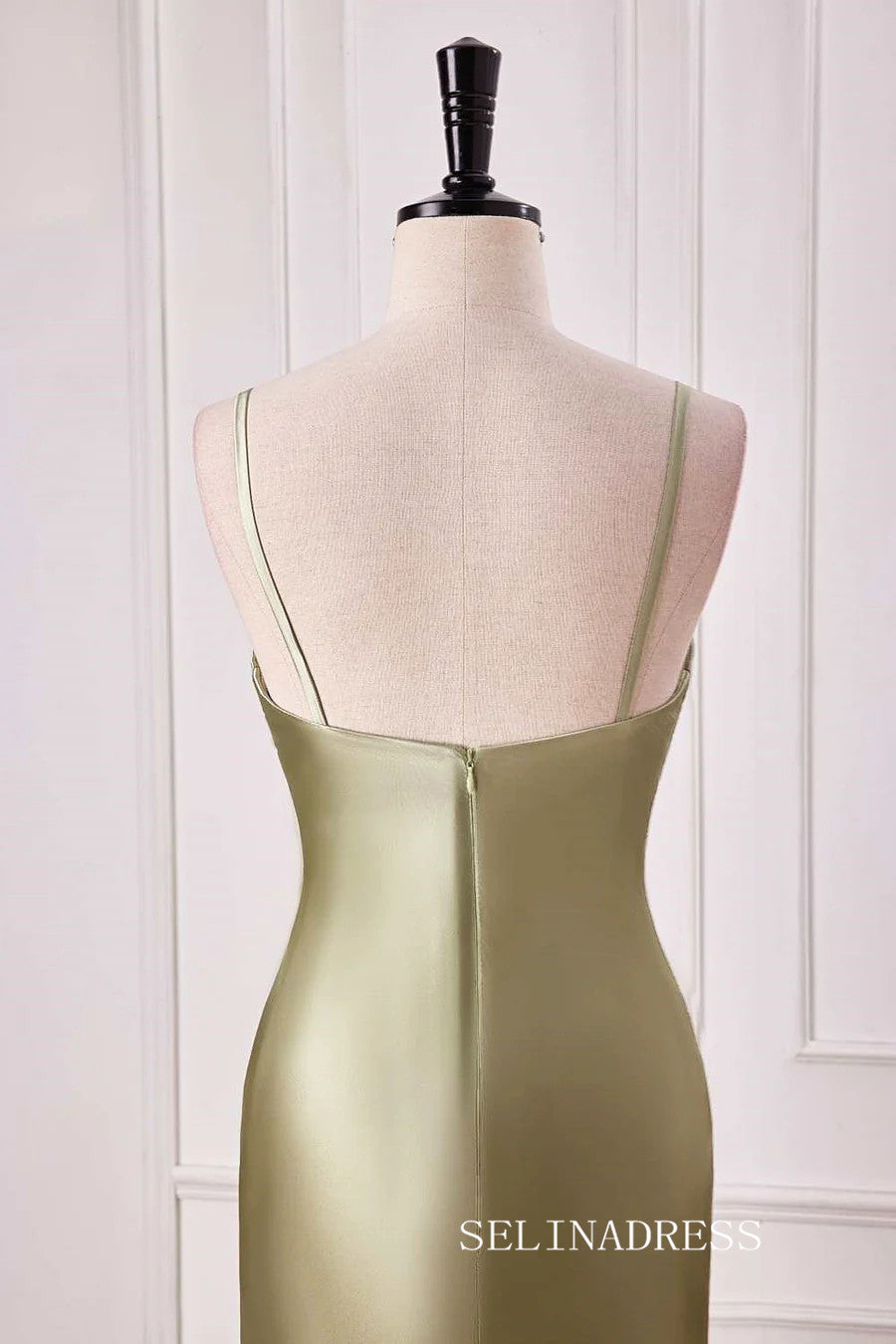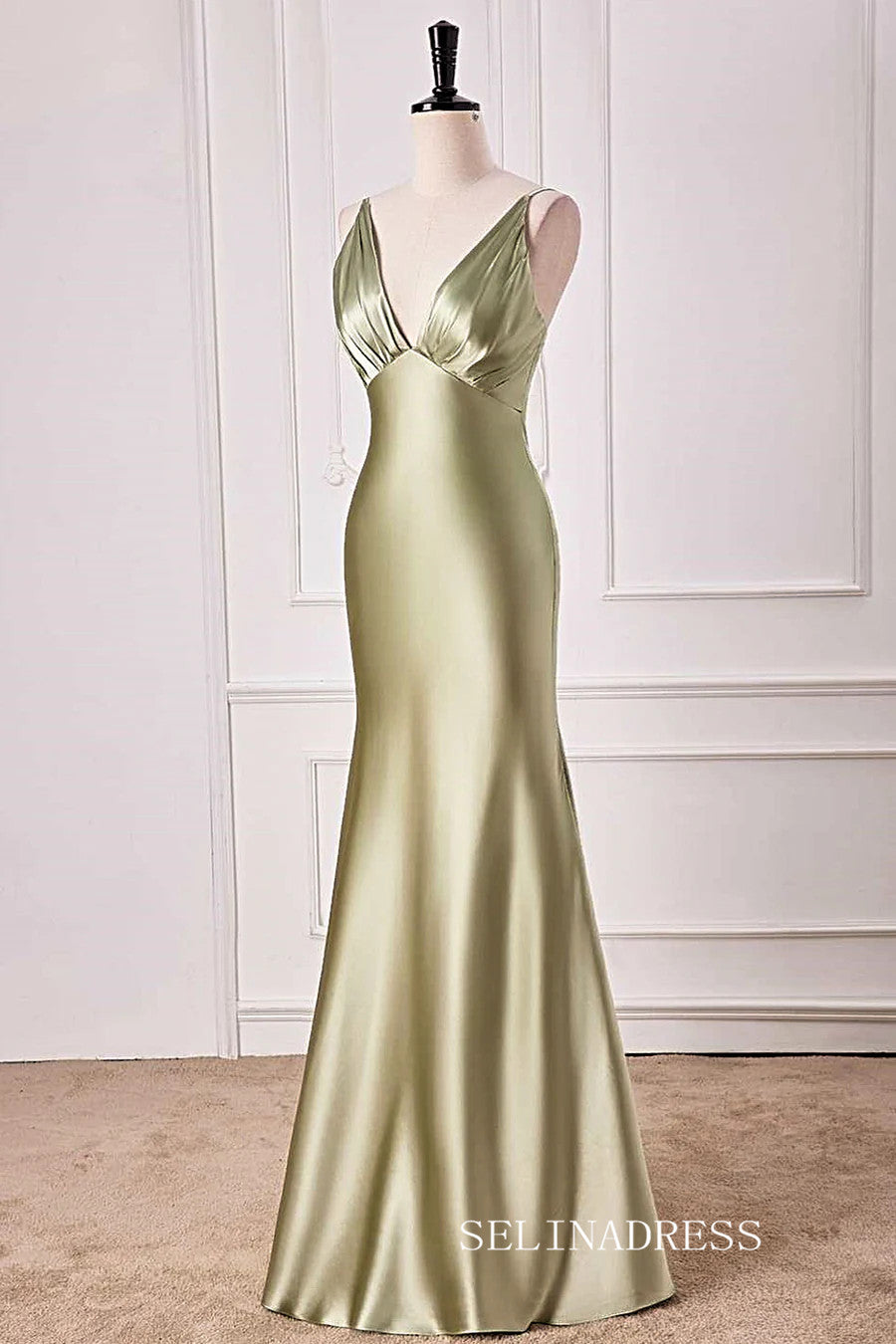 This long prom dress features a plunging V-neckline, a mermaid silhouette, and a floor-length skirt with flare at the hemline.