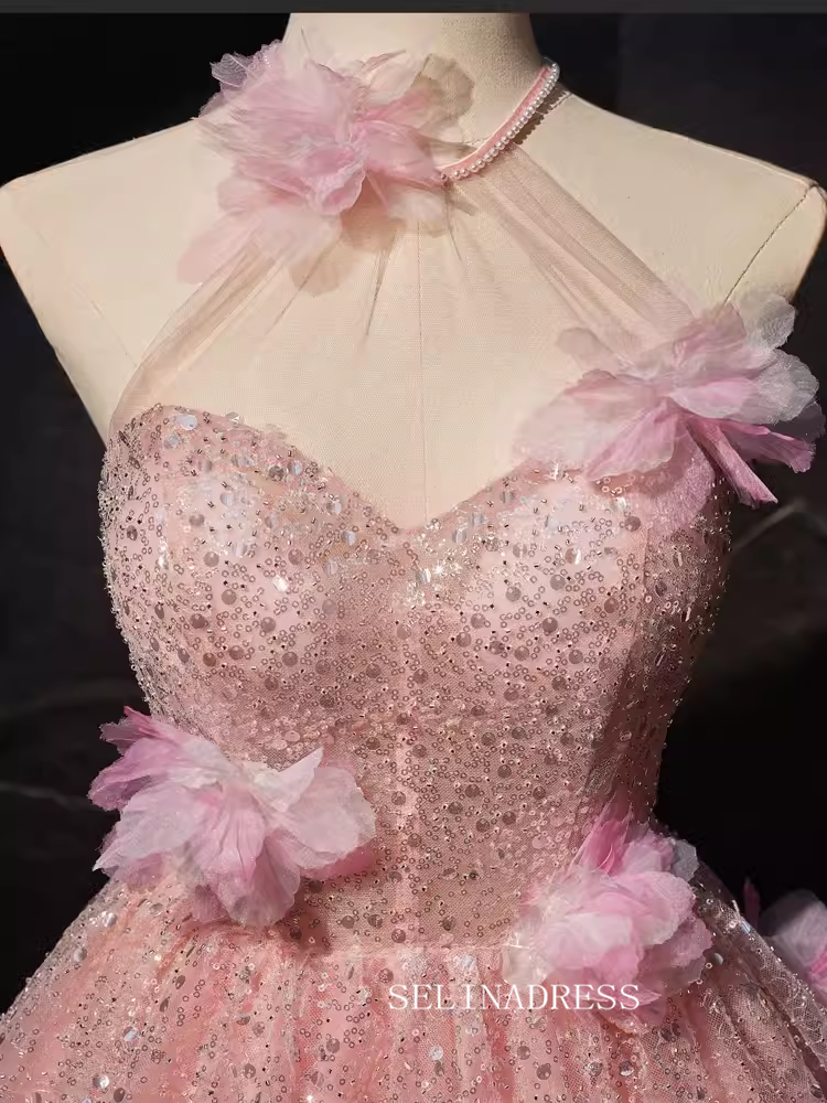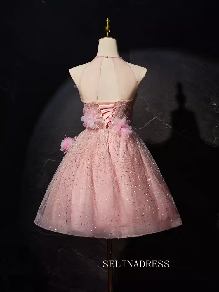 Shine in our Pink Floral Blossom Sequin Homecoming Dress BJ018, featuring a halter neck and stunning 3D flower details. With delicate pink sequins, this dress will make you stand out in the crowd. Perfect for any special occasion, this dress combines style and elegance for a truly memorable look.