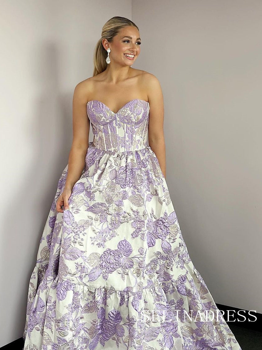 The pink floral long prom dress is a vision of romantic elegance. The sweetheart neckline gracefully frames the décolletage, emphasizing the femininity of the wearer. The intricate floral patterns add a touch of whimsy, creating a captivating and unique ensemble.