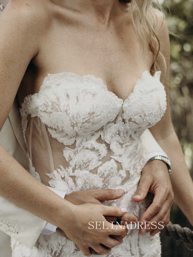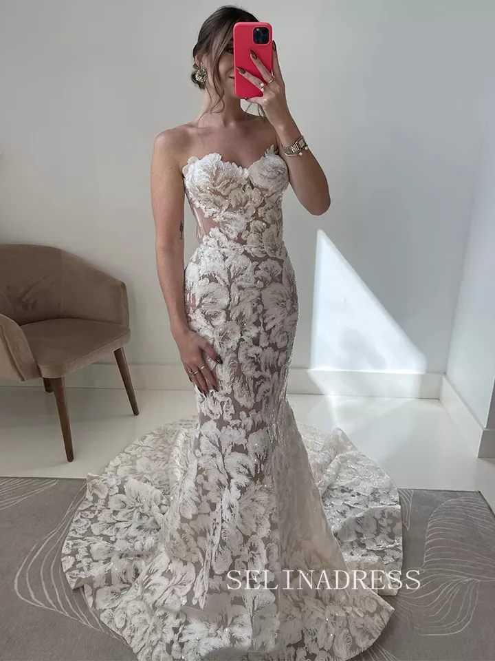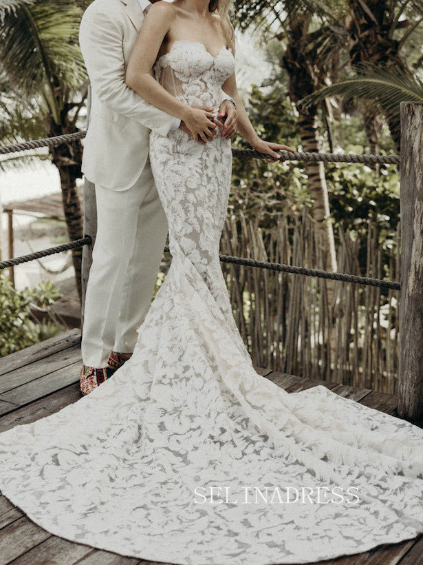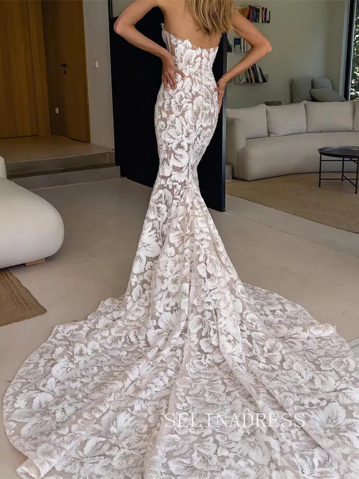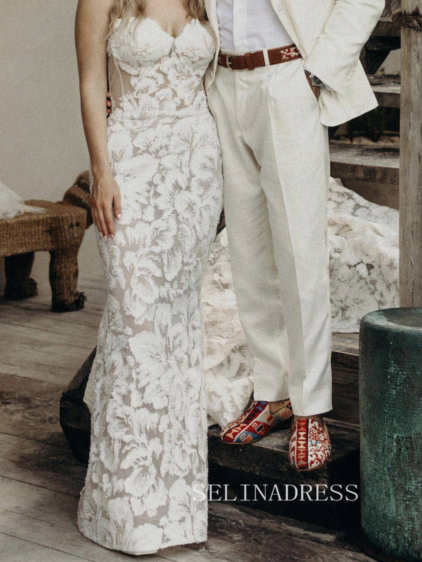 This SELINADRESS White Lace Mermaid Wedding Dress is a captivating choice for your big day. The white hue adds a touch of purity, while the intricate lace appliqué and fitted bodice add a touch of elegance. The flowing skirt adds grace, making you feel like a fairy tale bride.