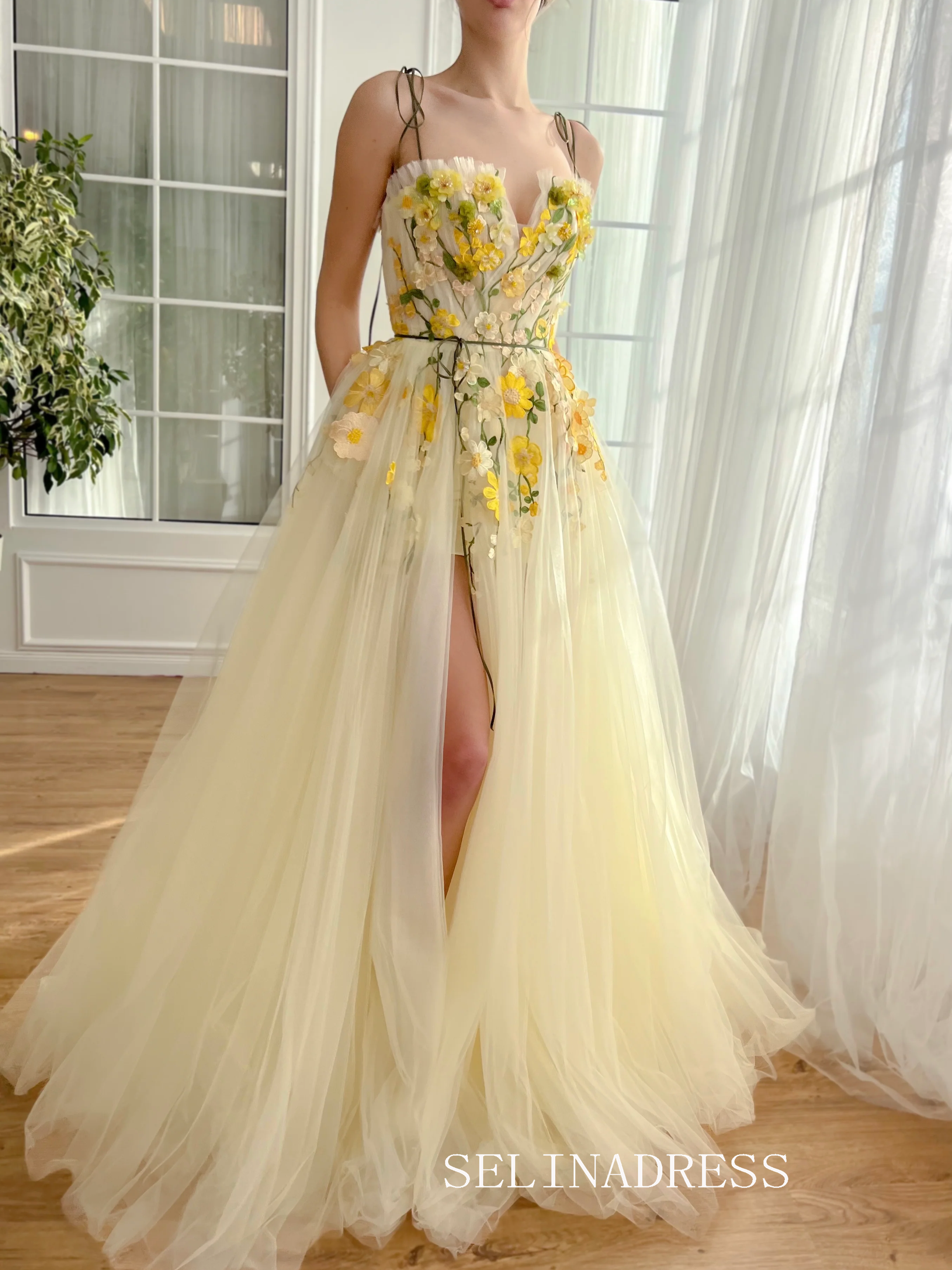 The yellow long prom dress radiates elegance and charm. Its bodice is adorned with intricate white flowers, while the skirt gracefully flows in a light yellow hue. The high slit adds a seductive touch, while the sheer fabric and floral accents create a dreamy aesthetic. A SELINADRESS masterpiece indeed.