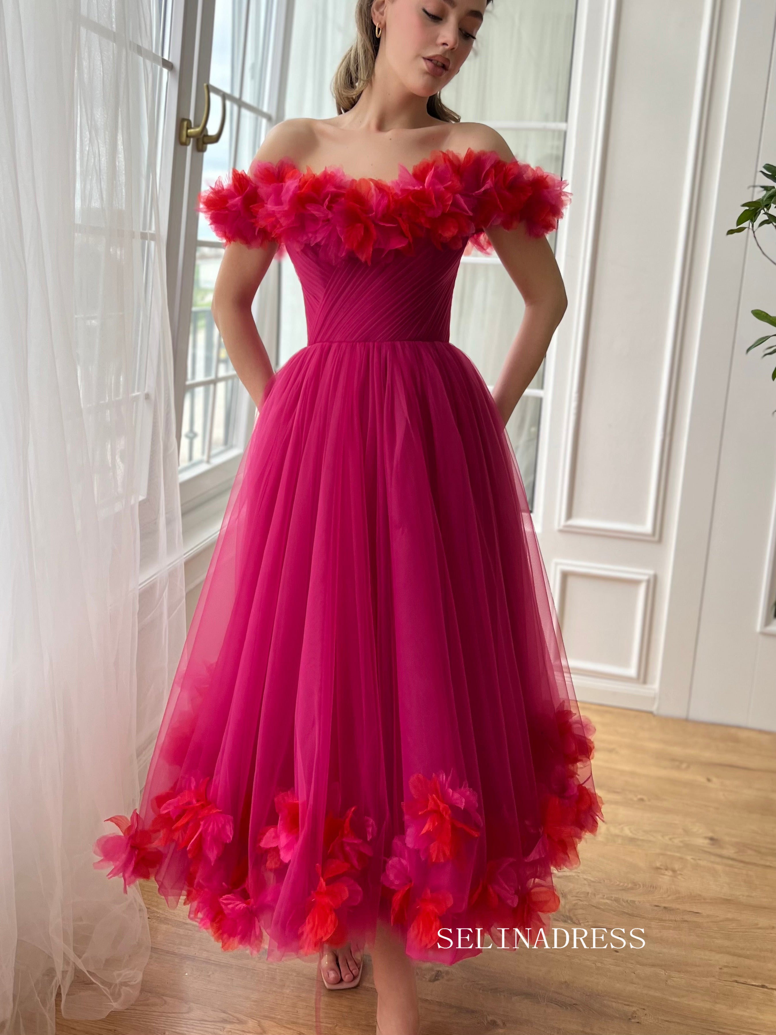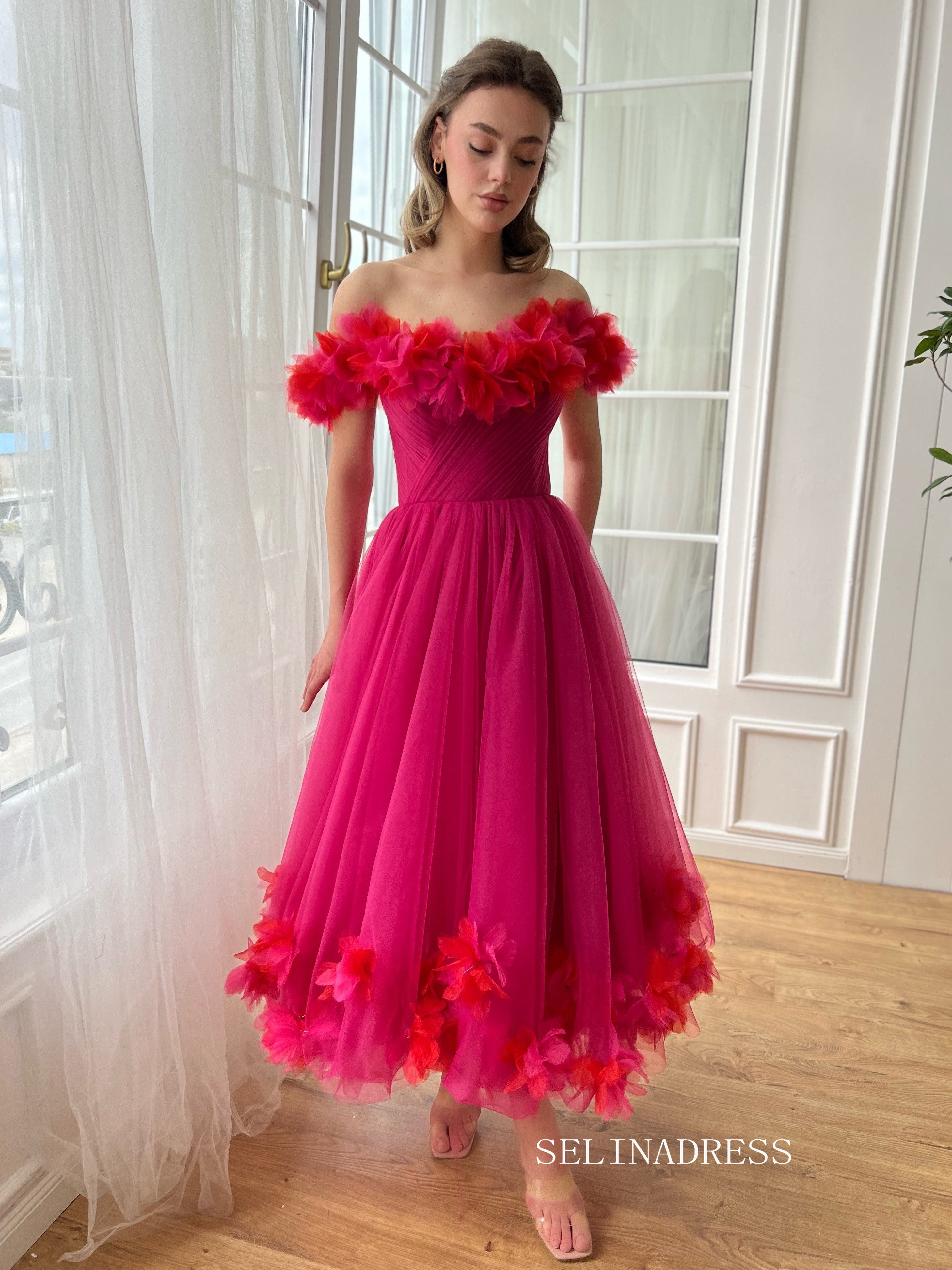 In a vibrant fuchsia color, this mid-length tulle dress is all about feminine allure and glamour. The strapless neckline and plunging top are supported by a full-boned bodice that frames a glamorous silhouette. Delicate and vivid flowers embellish the neckline and hemline, adding a touch of romance. The dress also features practical inside pockets and a charming lace-up back, combining functionality with elegance for any special occasion.