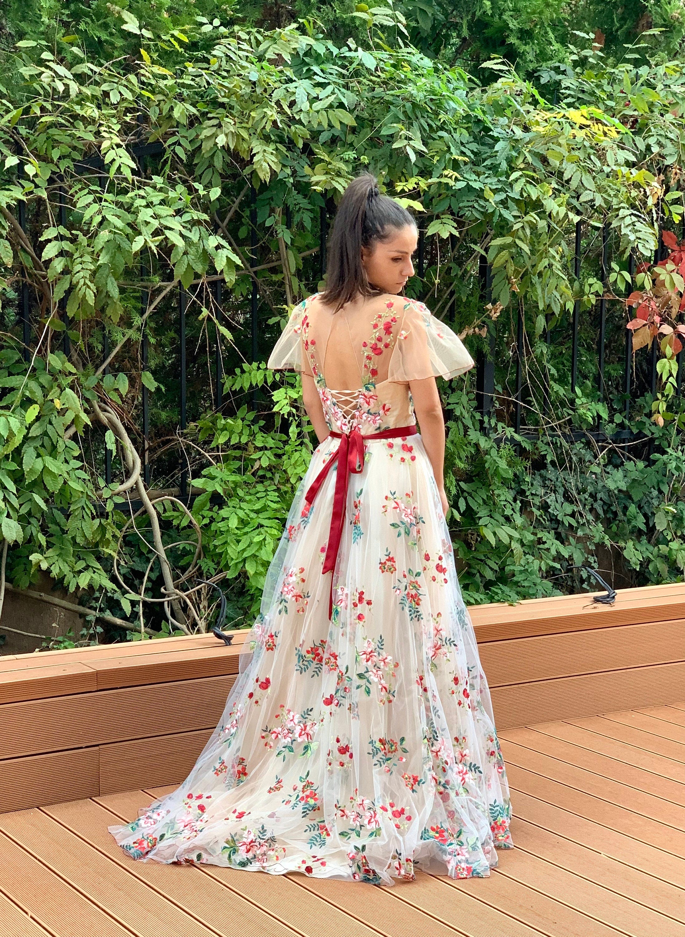 Floral wedding dress in nude colour is made out of tulle, unique embroidered lace with wildflowers, sweetheart neckline, low back and features an A-line silhouette. Non-traditional bridal gown has built bra cups for better support of the bust, and closes with comfortable corset. The bodice is embroidered by hand with unique floral lace ornaments and stunning butterfly sleeves.