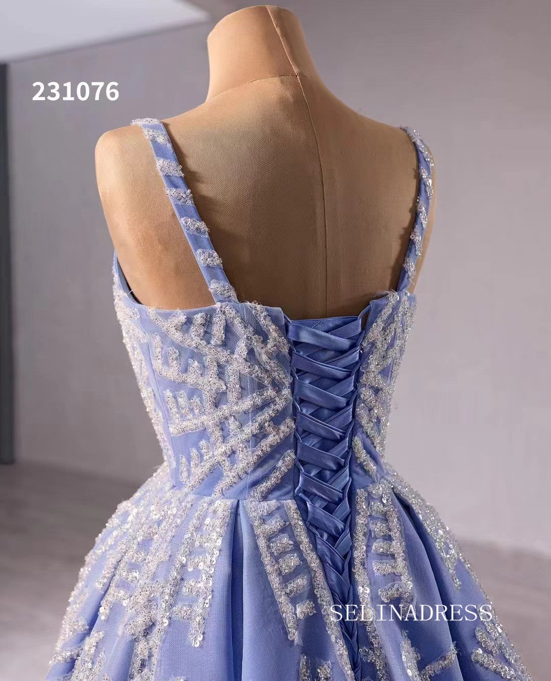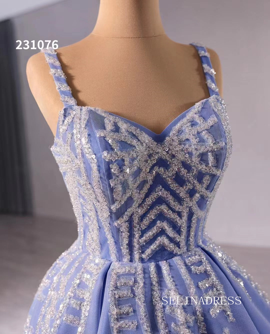 The blue evening dress stands out with its captivating design. Featuring ruffled shoulders and flared sleeves, it is adorned with sparkling white sequins and embellishments. Elegantly displayed on a transparent stand against a gray backdrop, it exudes luxury and sophistication, embodying SELINADRESS's signature style.