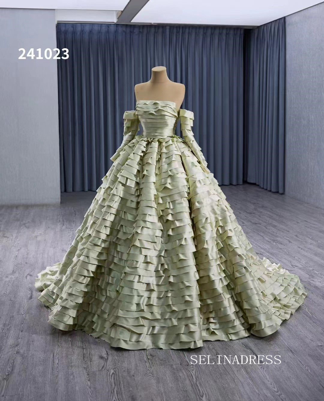 Elevate your wedding style with our Green Ruffled Off the Shoulder Wedding Dress. The bold green color and elegant ruffle detailing make this dress a standout choice. The off the shoulder style adds a touch of romance, while the removable sleeves offer versatility for any occasion.