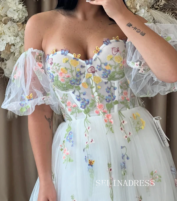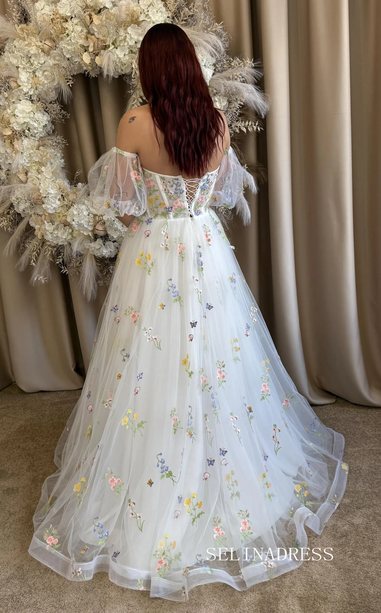 This enchanting off-shoulder wedding gown, adorned with delicate floral and butterfly embroidery, exudes romantic charm. The light, airy tulle skirt creates a whimsical, ethereal silhouette, while the fitted bodice accentuates elegance, making it perfect for a fairytale wedding.