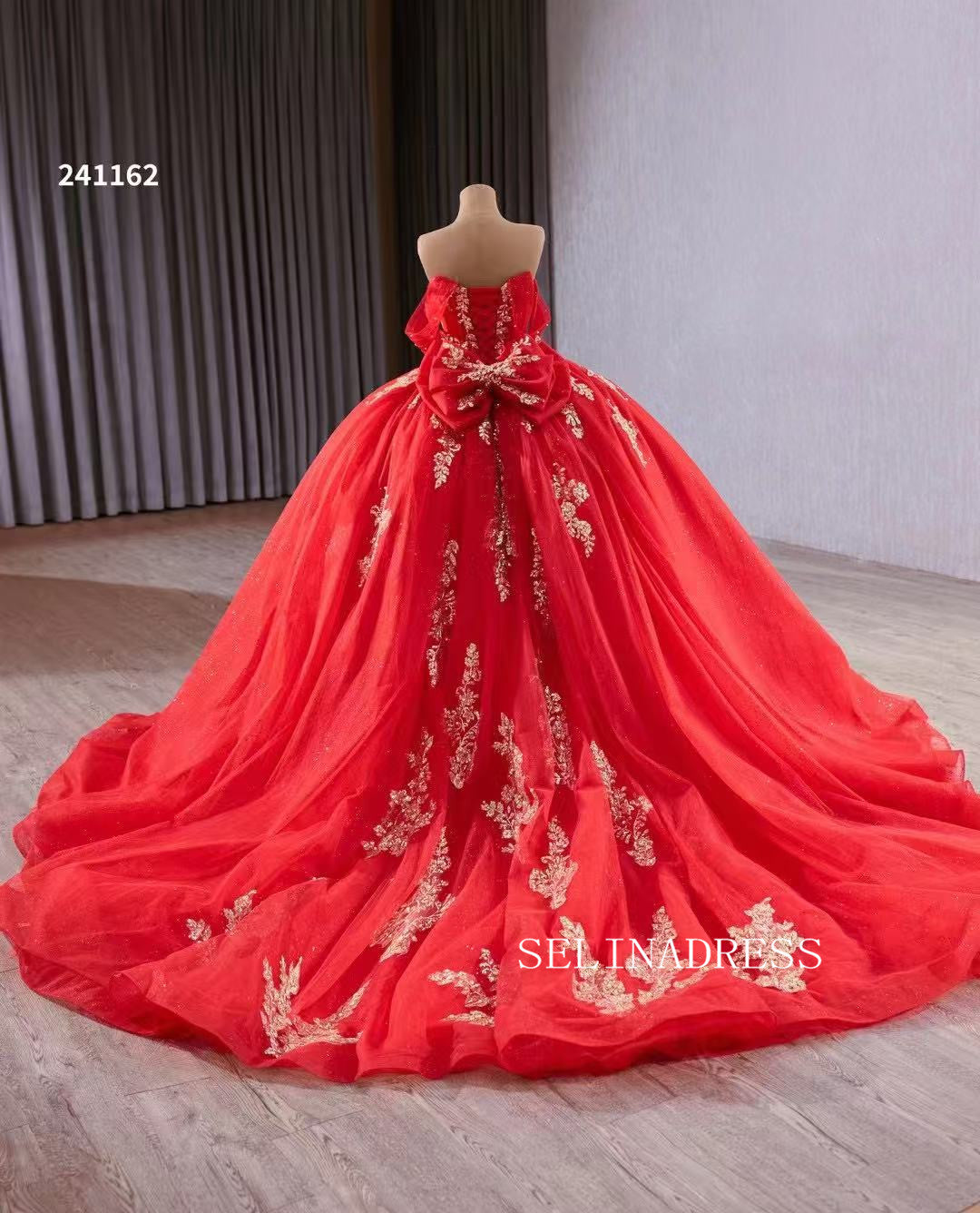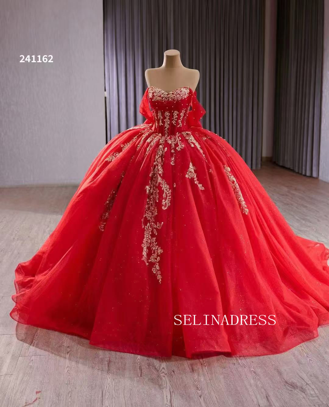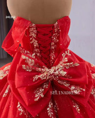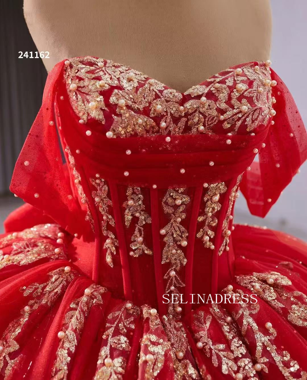 This red off-the-shoulder ball gown with golden embellishments, 241162 by SELINADRESS, is a dazzling choice. The white bodice adds a touch of purity, while the red tulle skirt with gold sequins and floral accents adds volume and elegance. Perfect for making a statement at your special occasion.