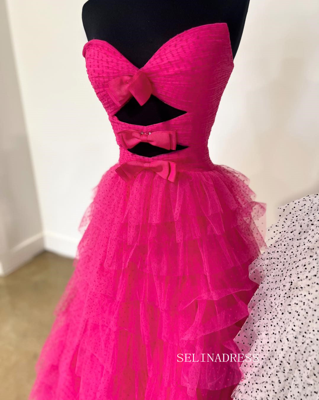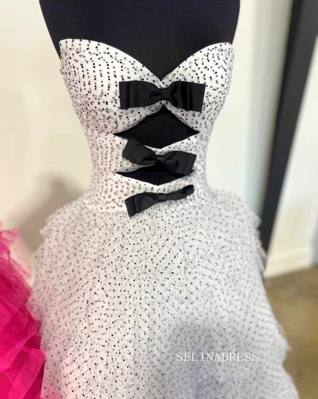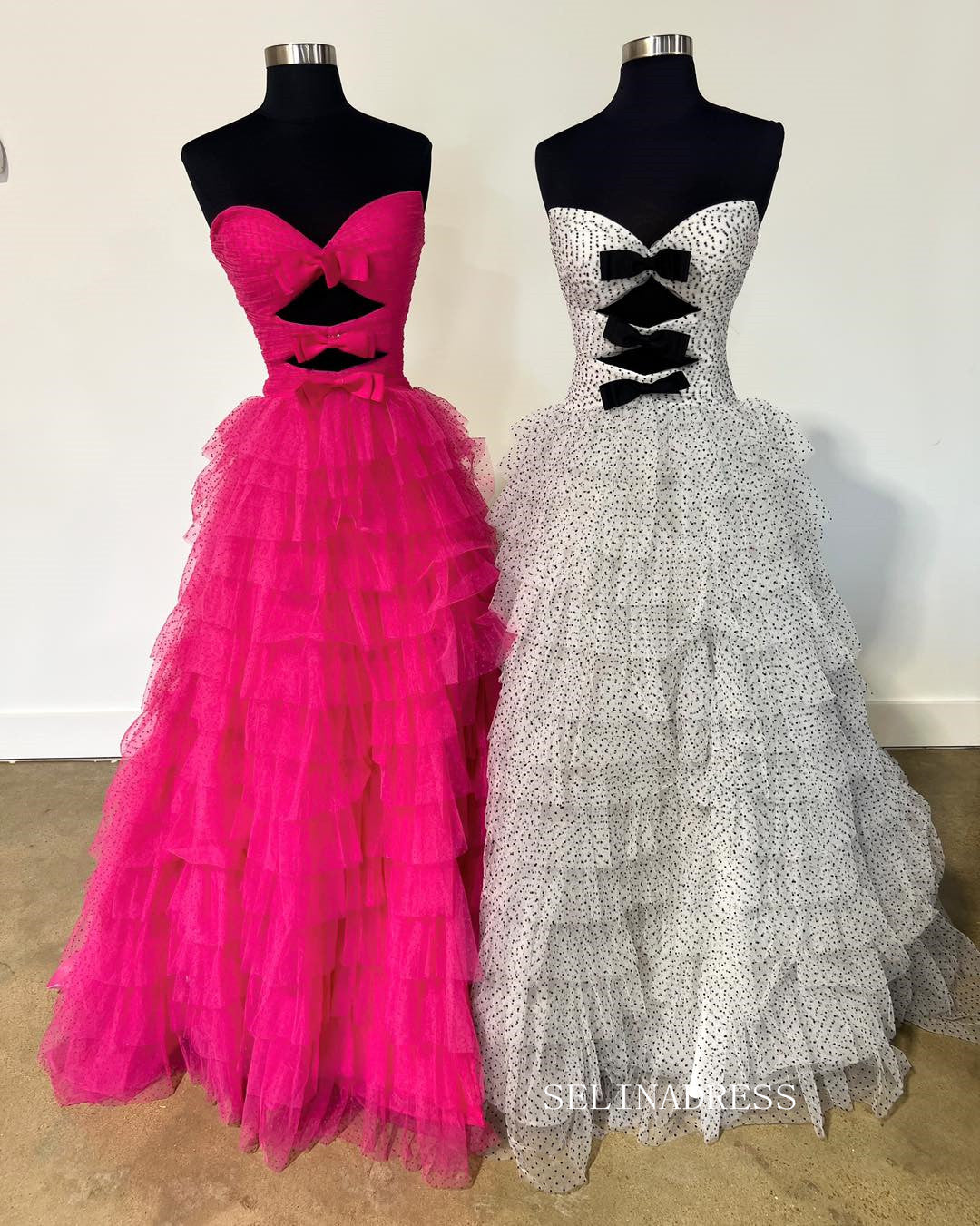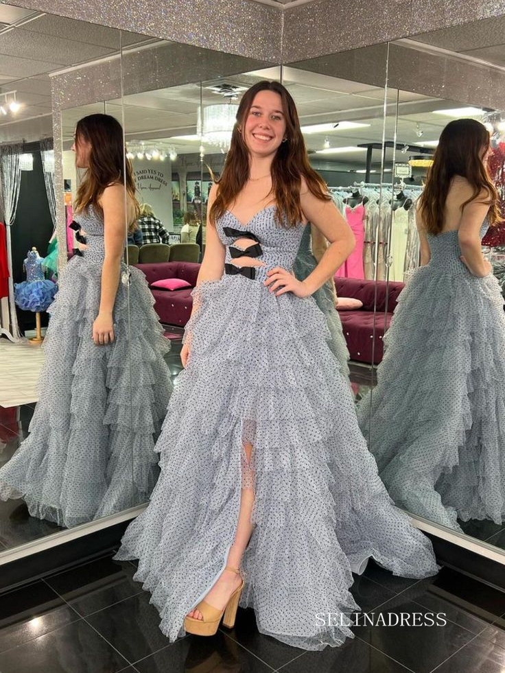 The delightful dotted mesh ball gown is a playful display of style. The bodice, adorned with a fetching bowknot at the bust, showcases a touch of feminine allure. The skirt, made of multiple layers of mesh, creates a flattering silhouette that flows gracefully. This dress is perfect for the woman who wants to exude a charming, youthful essence.