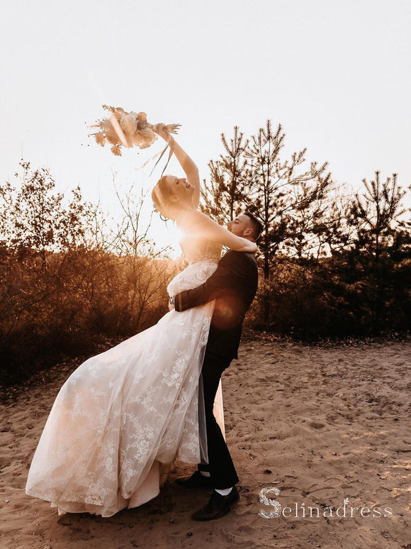 A-line Spaghetti Straps Lace Beaded Open Back Wedding Dresses Bridal Gowns CBD089
