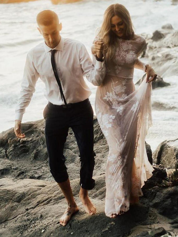 Sheath Rustic Lace Beach Wedding Dress With Long Sleeve Bridal Wedding Dresses SEW069