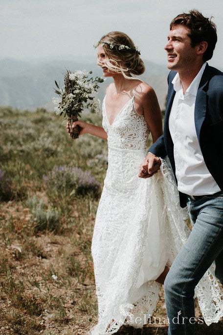 Chic A-line V neck Boho Wedding Dress Rustic Lace Wedding Gowns MLS045