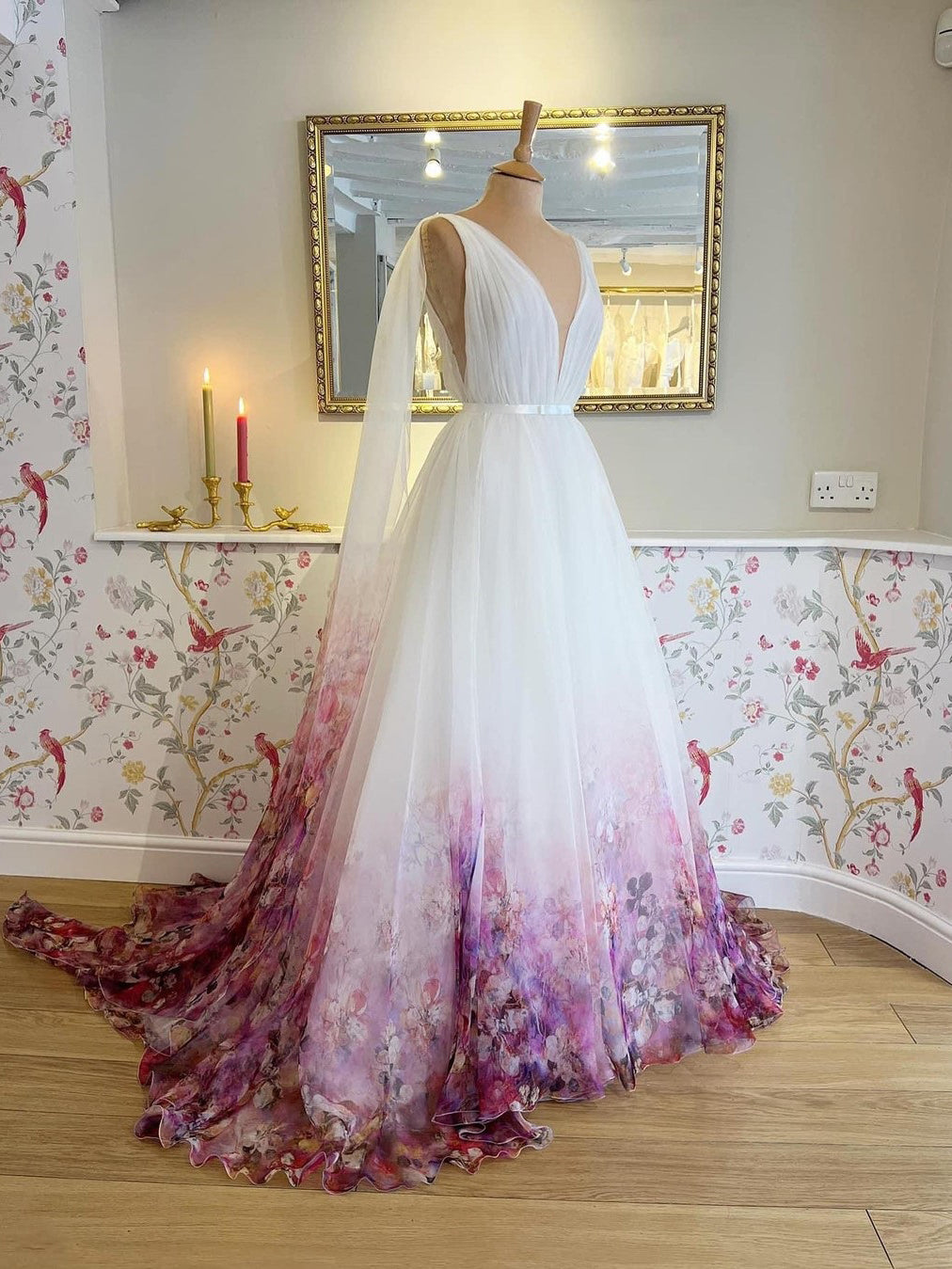 The dress is beautiful! I was pretty skeptical ordering online and not seeing the dress in person before I bought it. Expecting the fabric to be less quality than the photo shows. I’m completely impressed. The dress looks exactly like the photos. The floral appliqué has beautiful bead work. The quality of the materials is perfect. It fits almost perfect. Will have to have mild alterations through the waist line. I will post photos of the dress on because I see no photos have been posted of this dress on someone.