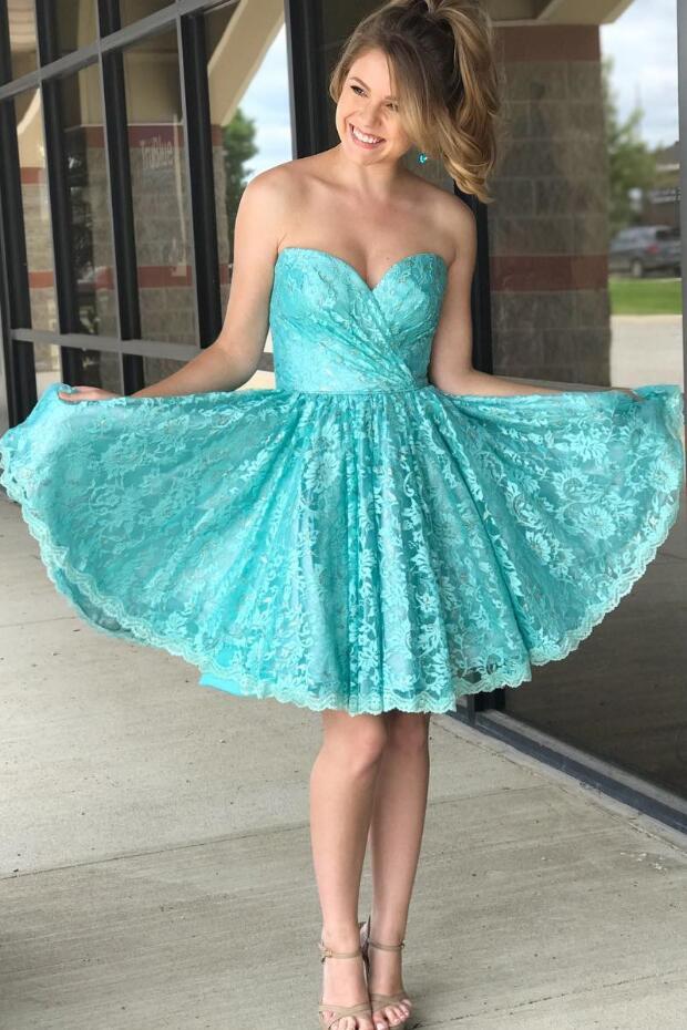 Ruched Sweetheart Lace Tiffany Blue Homecoming Dresses Short ANN5501