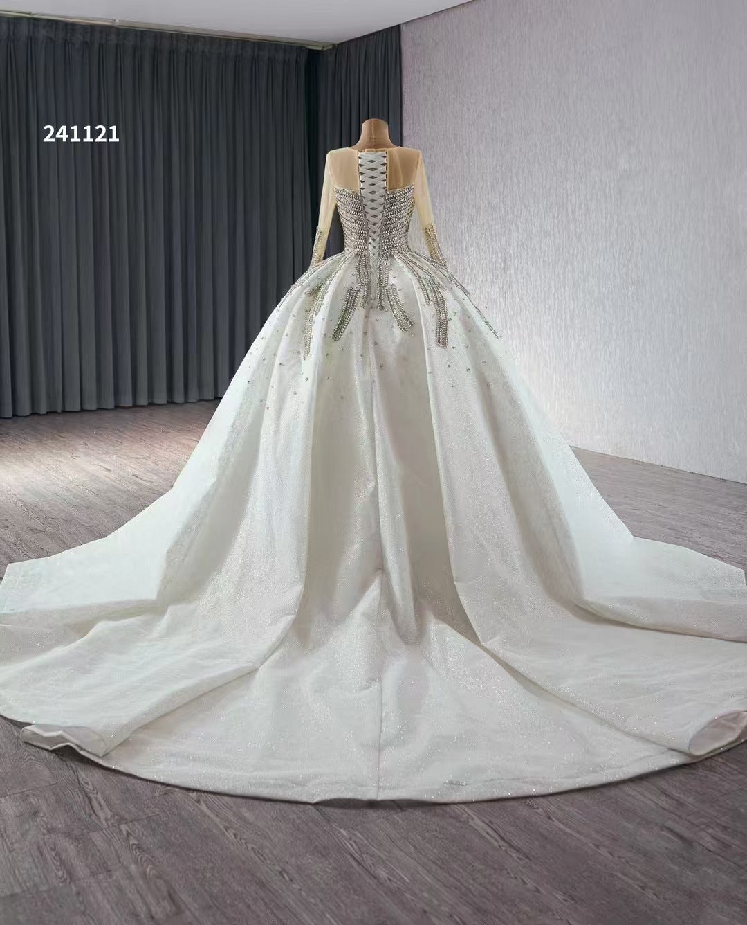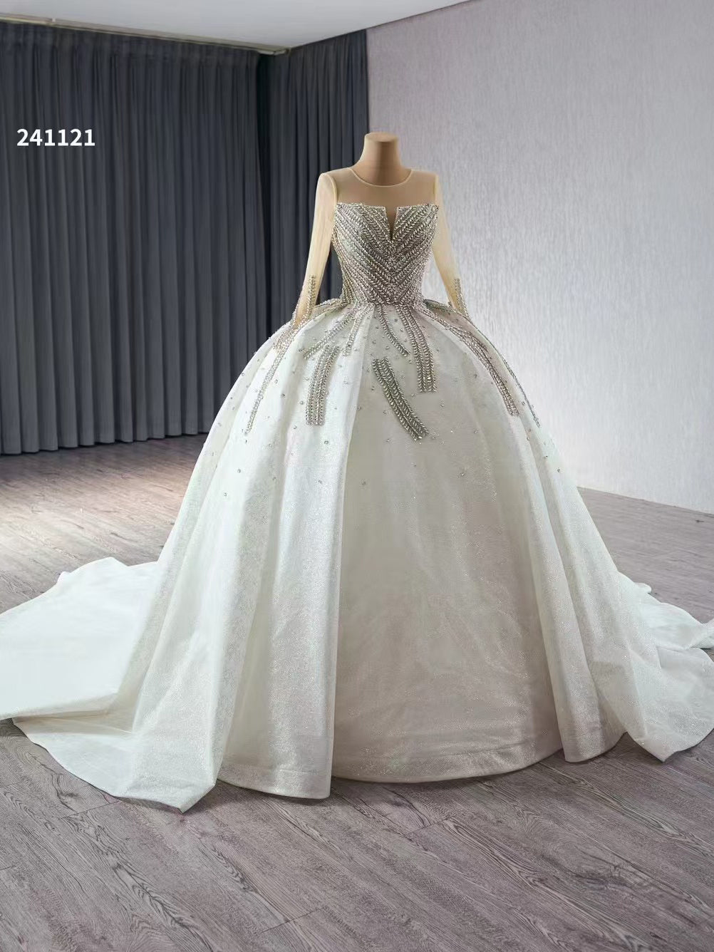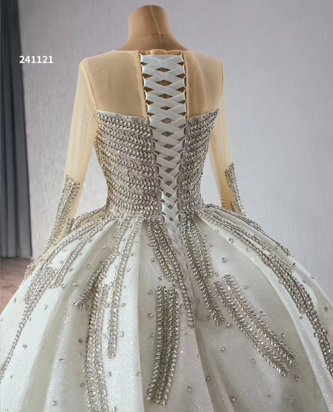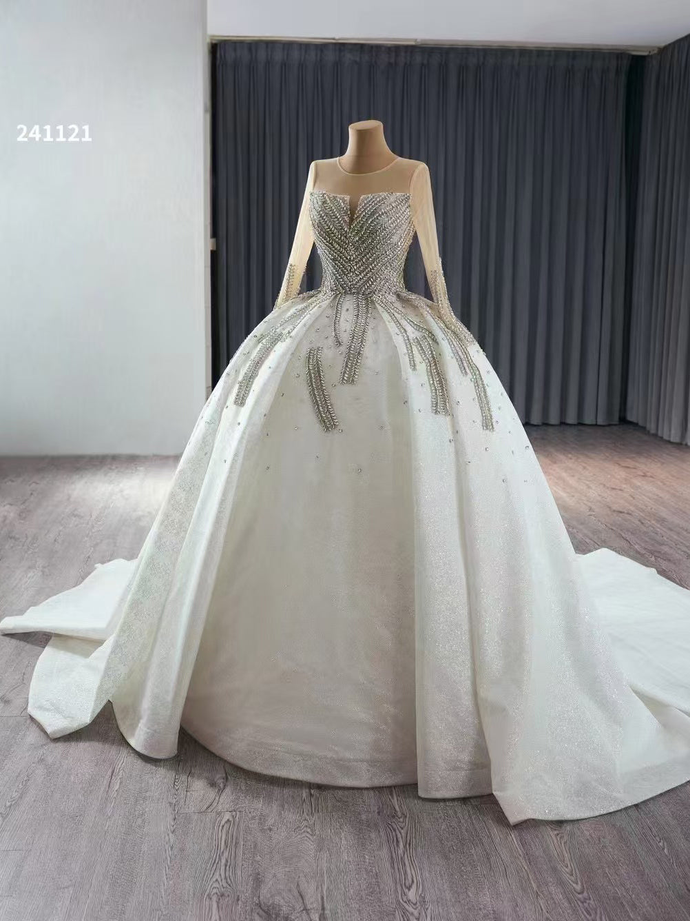 This white and silver beaded ball gown wedding dress 241121 is a breathtaking choice for your wedding day. The shimmering silver embellishments and deep V-neckline add a touch of glamour, while the fluffy skirt provides volume. The long sleeves enhance elegance, making you feel like a royal bride.