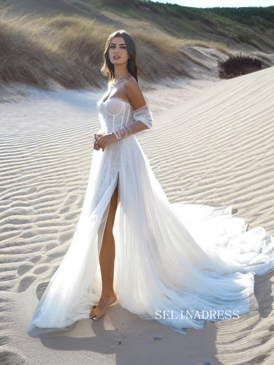 The Wedding Dress features a soft tulle fabric and a signature beach boho design with a high slit and removable long sleeves. This dreamy, romantic style provides the perfect combination of elegance and comfort for your special day.