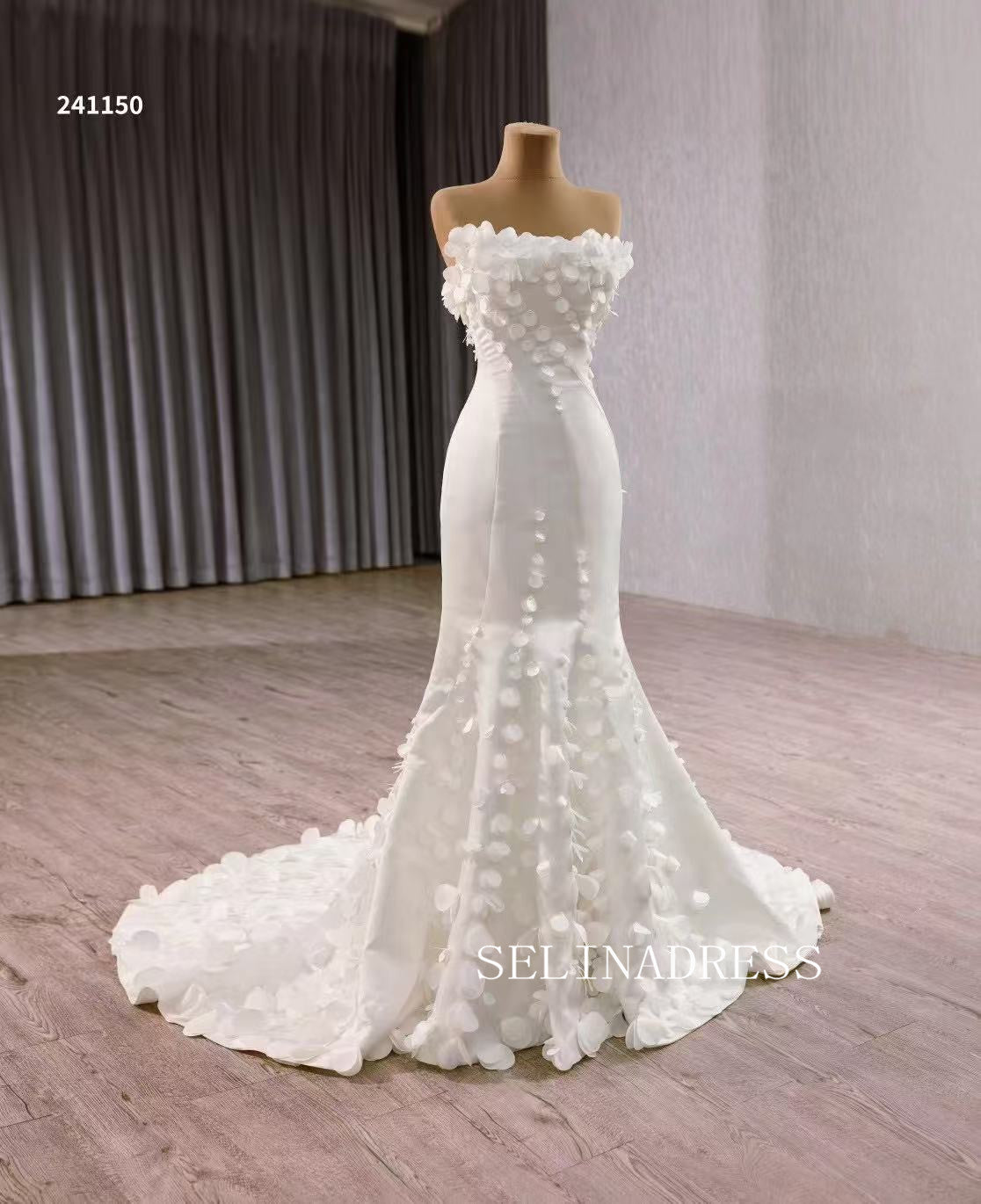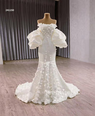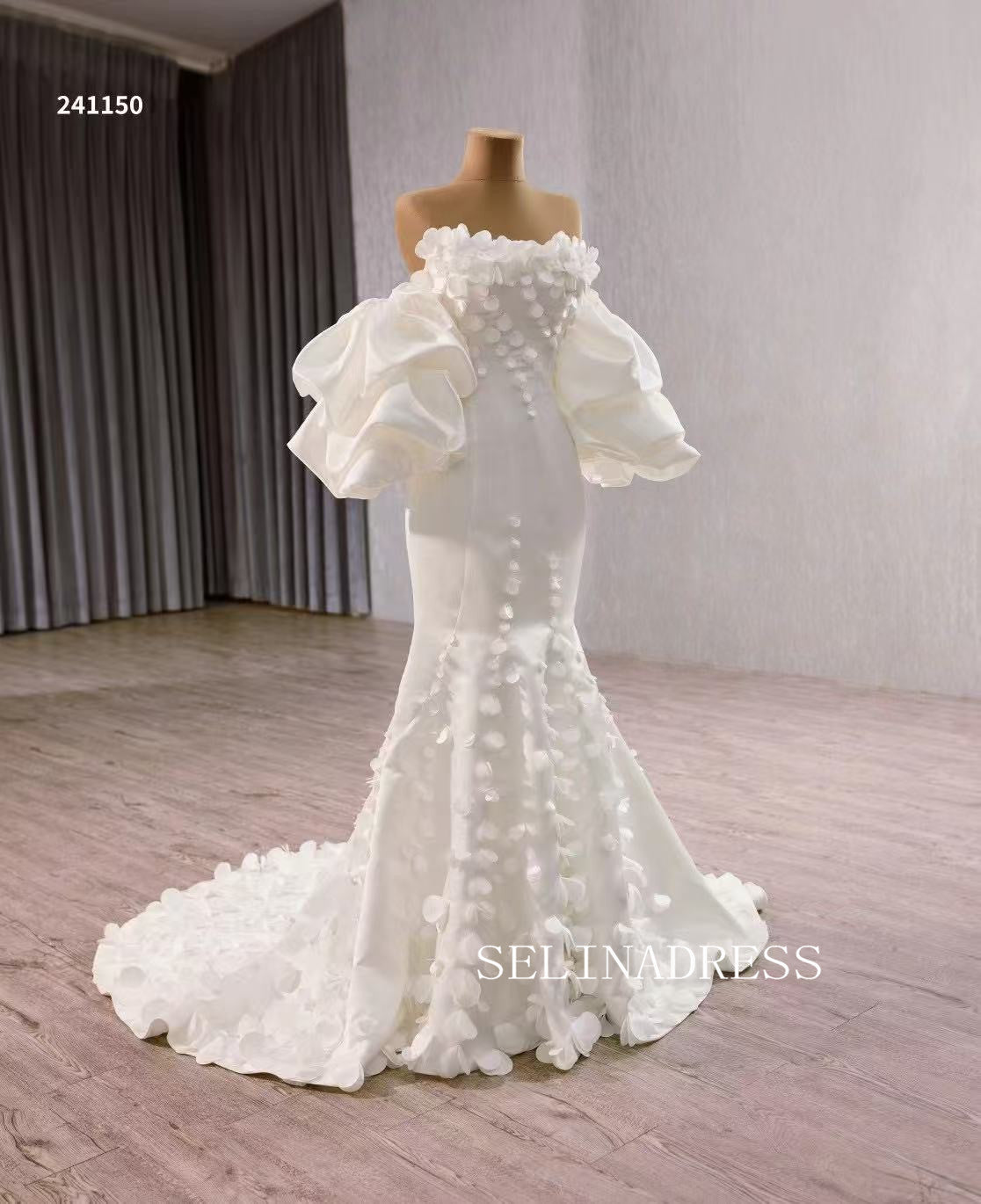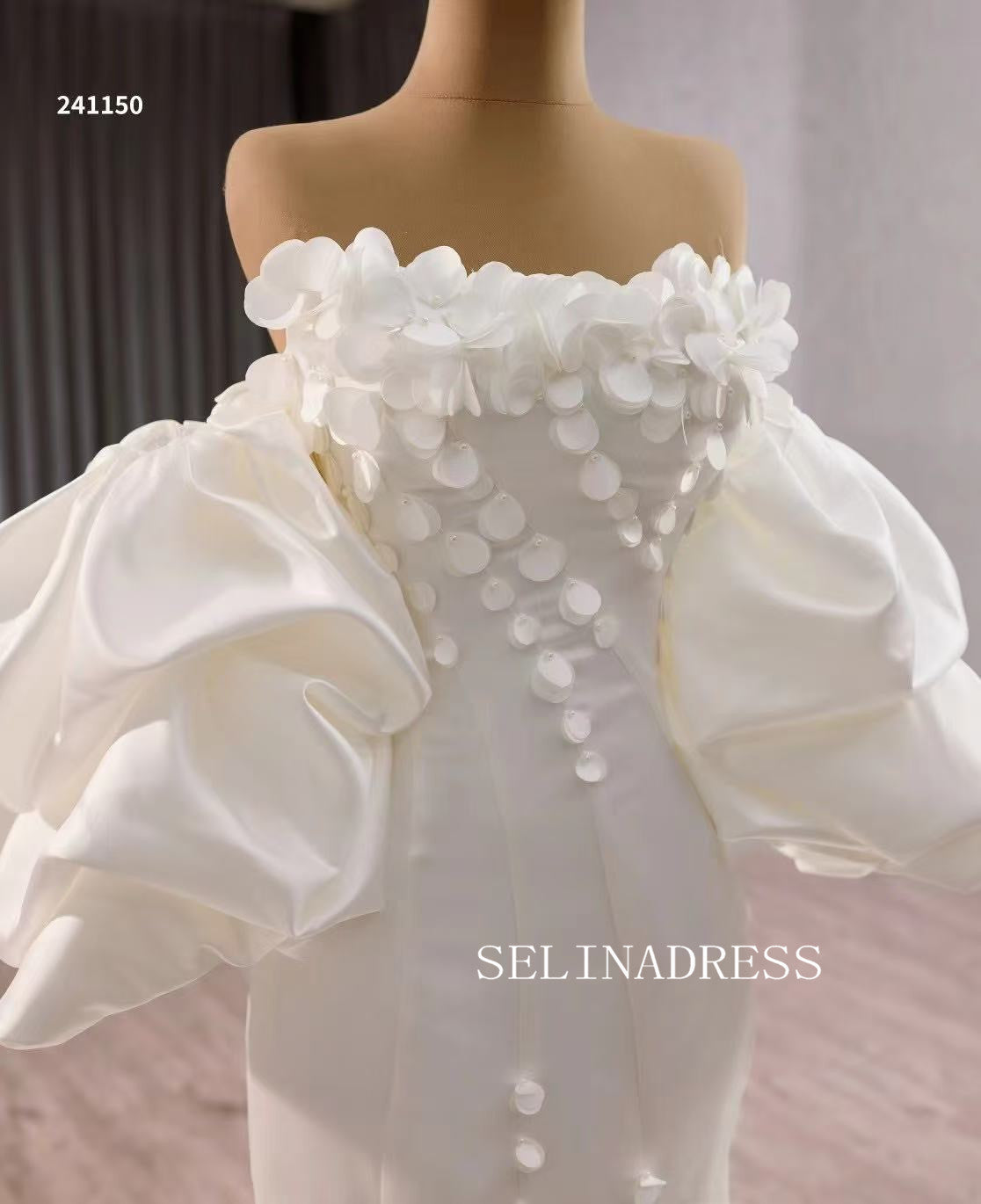 This white mermaid wedding dress with puff sleeves, 241150 by SELINADRESS, is a breathtaking choice. The floral embellishments add a touch of elegance, while the fitted bodice and flowing skirt ensure a flattering silhouette. Perfect for making a statement on your special day.