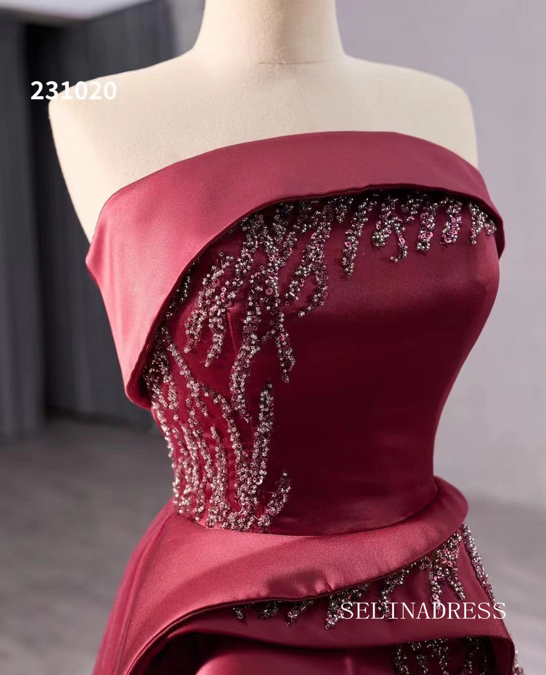 The evening dress exudes elegance and sophistication, featuring a strapless design with sparkling sequins and intricate ruffles on the bodice. The skirt is crafted from sheer fabric, trailing gracefully in a long hem, accentuating the deep red hue that contrasts beautifully against the gray backdrop. The dress is adorned with a "SELINADRESS" label, likely indicating its luxurious brand identity.