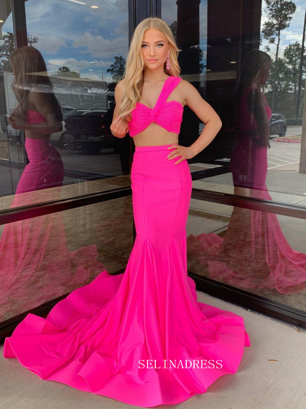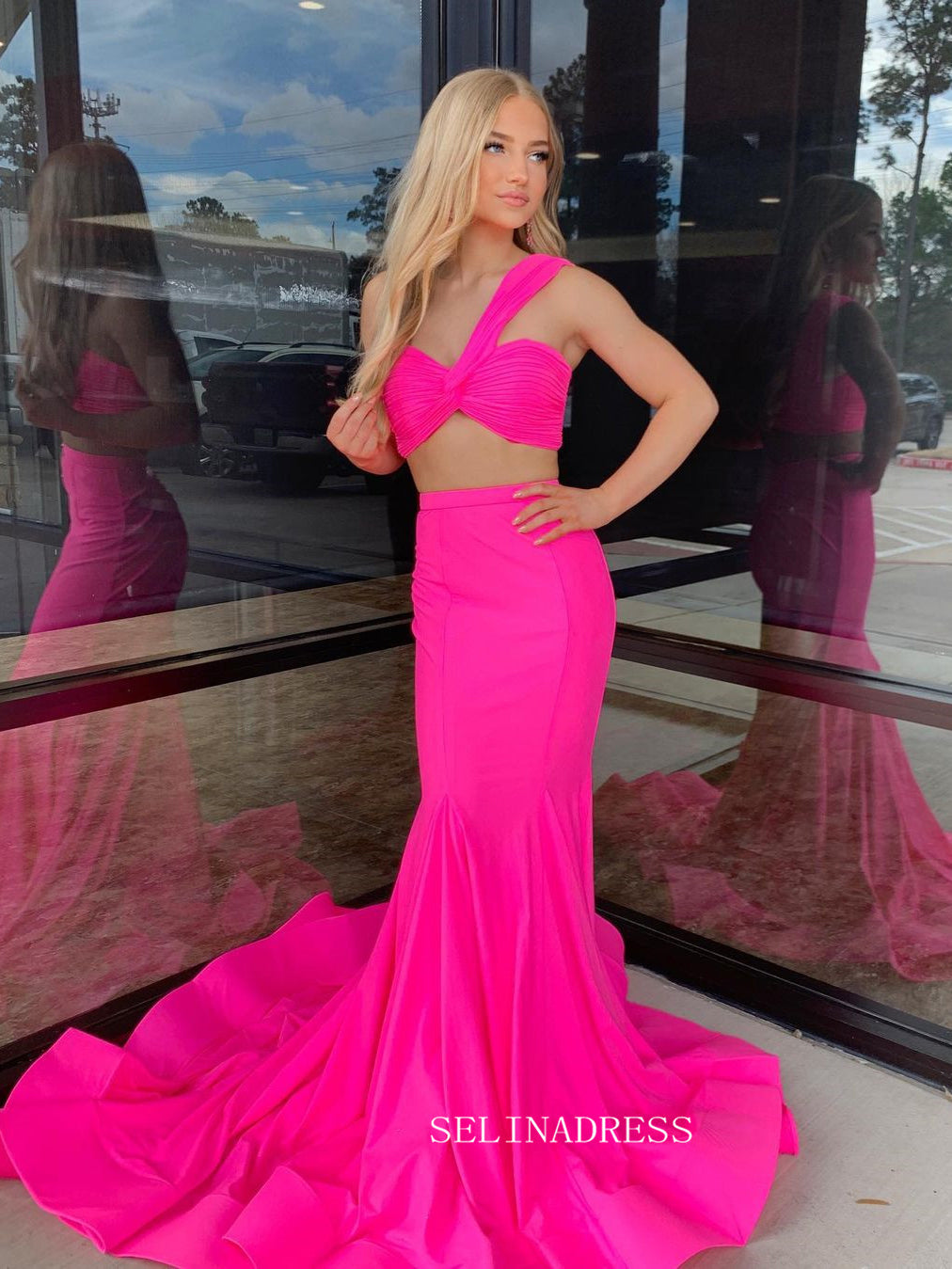 This hot pink mermaid two-piece long evening dress is a stunning blend of elegance and modernity. The single-shoulder design adds an edgy, asymmetrical touch, while the mermaid silhouette gracefully flows to the floor. The intricate details of the top and skirt create a seamless, harmonious look. This dress is a statement piece, sure to turn heads and capture the spotlight at any formal occasion.