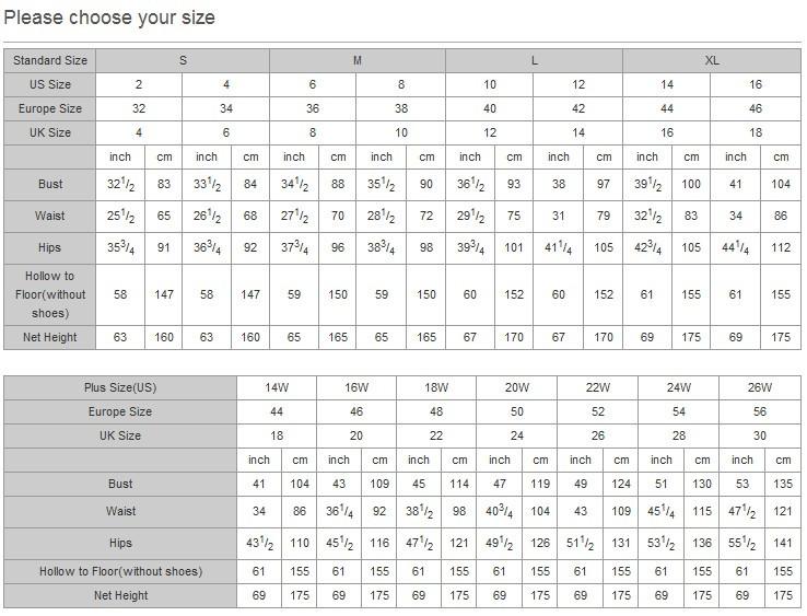 When you choose "Customer size", please leave us a message about your bust, waist, hips, hollow to floor with bare foot, extra heels and other necessary measurements.