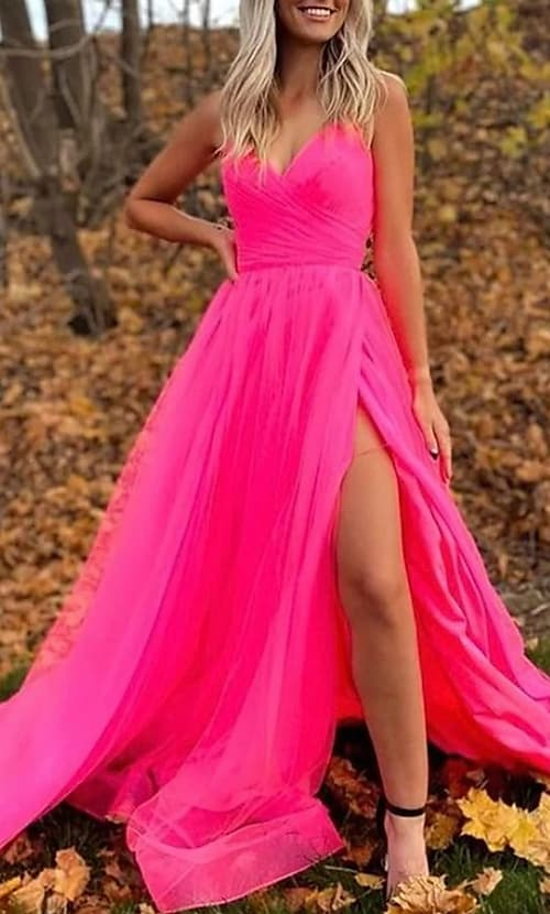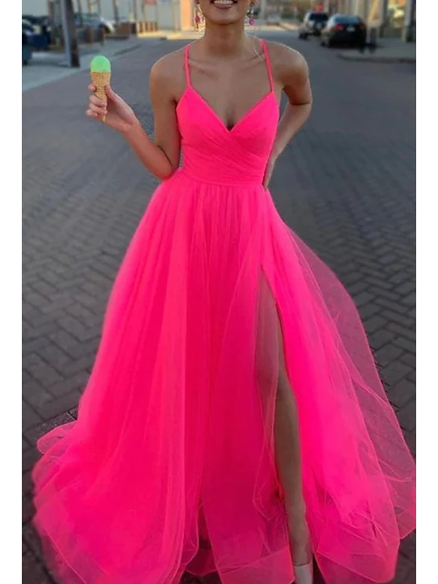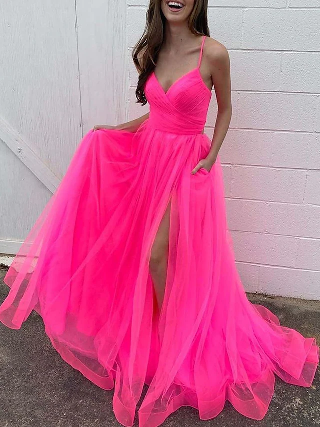Modsele elegant hot pink A-line long prom dress features with spaghetti straps, pleated bodice and lace up back.