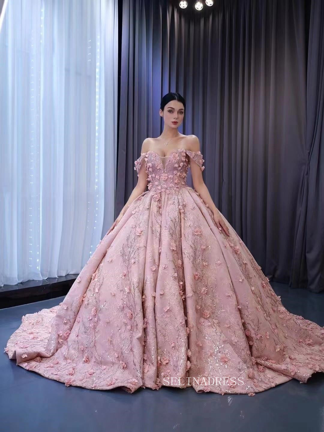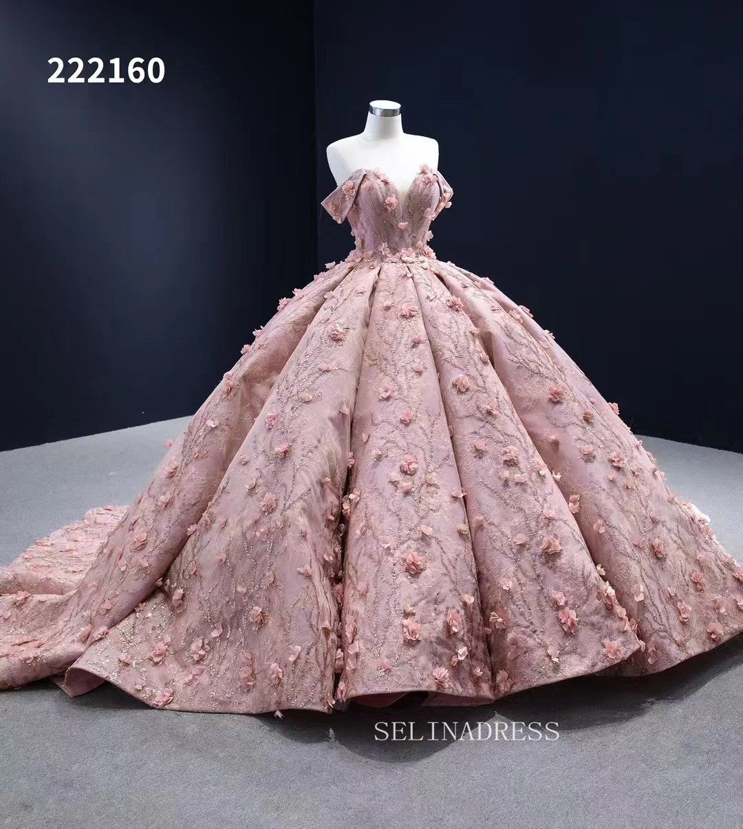 This stunning 3D Flower Pink Quince Dresses Ball Gown Wedding Dress Off the Shoulder is tailored to perfection with a 60cm long train. Feel the luxury of wearing the finest lace and make an unforgettable entrance on the big day. Are you ready to make your dream look come true?